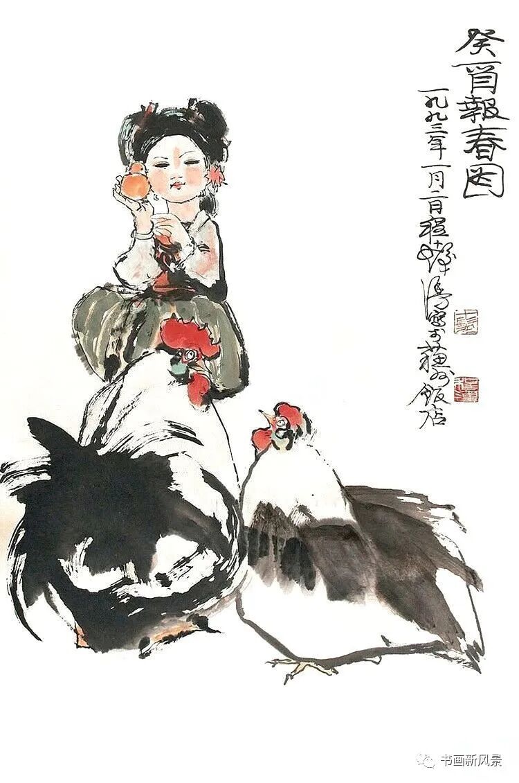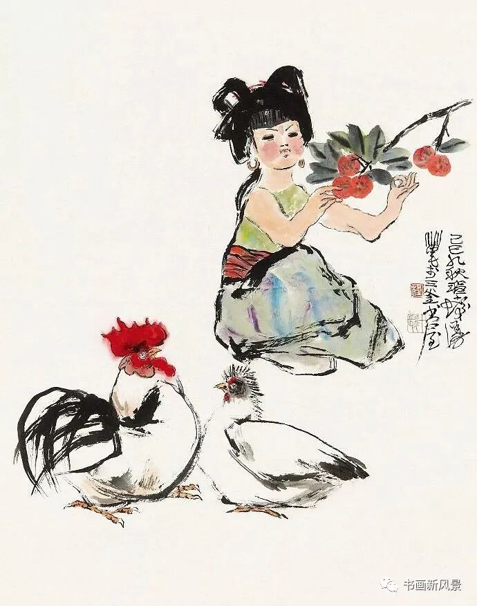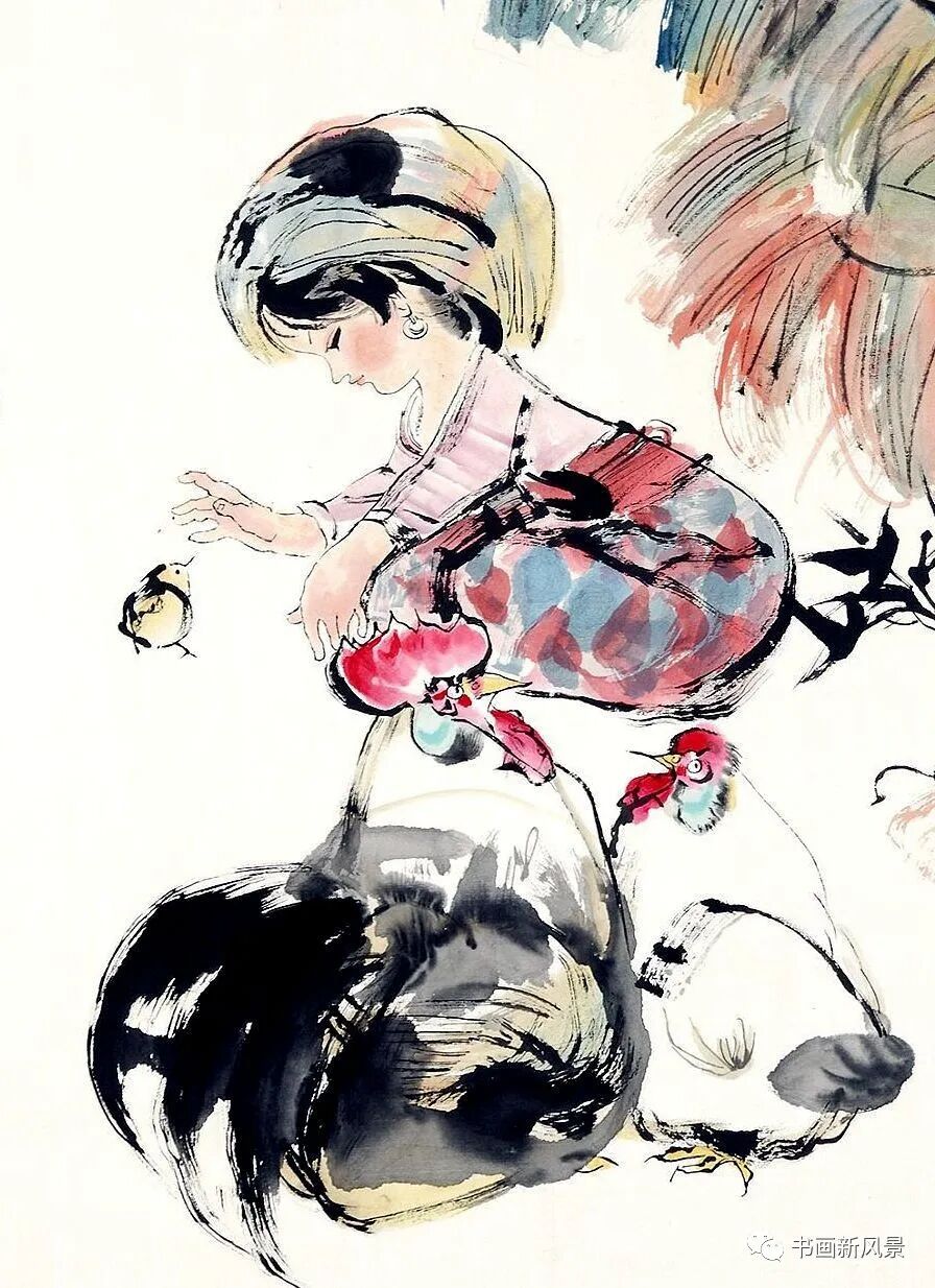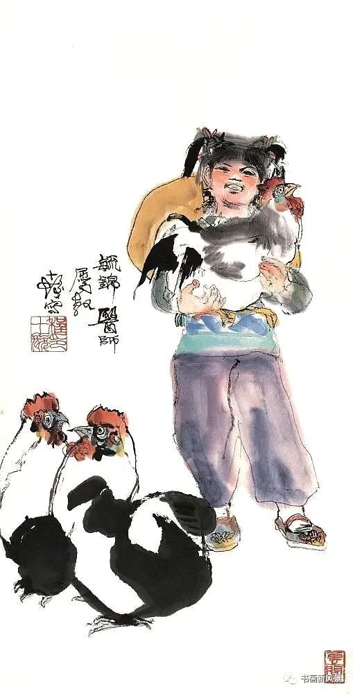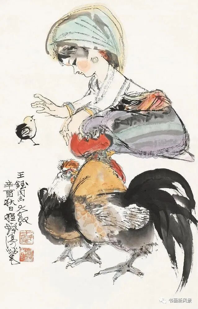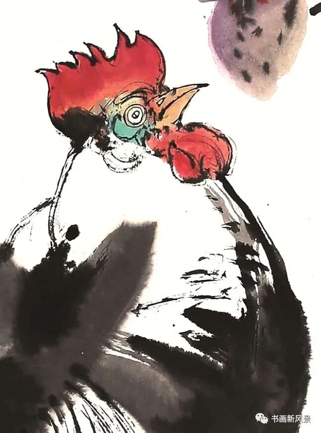 程十发很喜欢画鸡,他笔下的鸡,笔墨生动,夸张有趣。