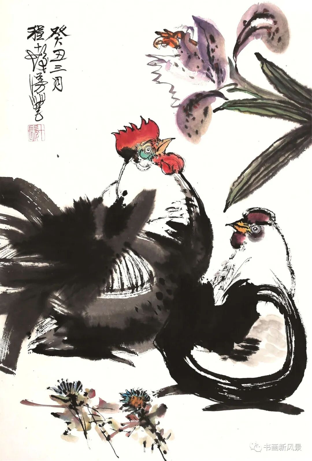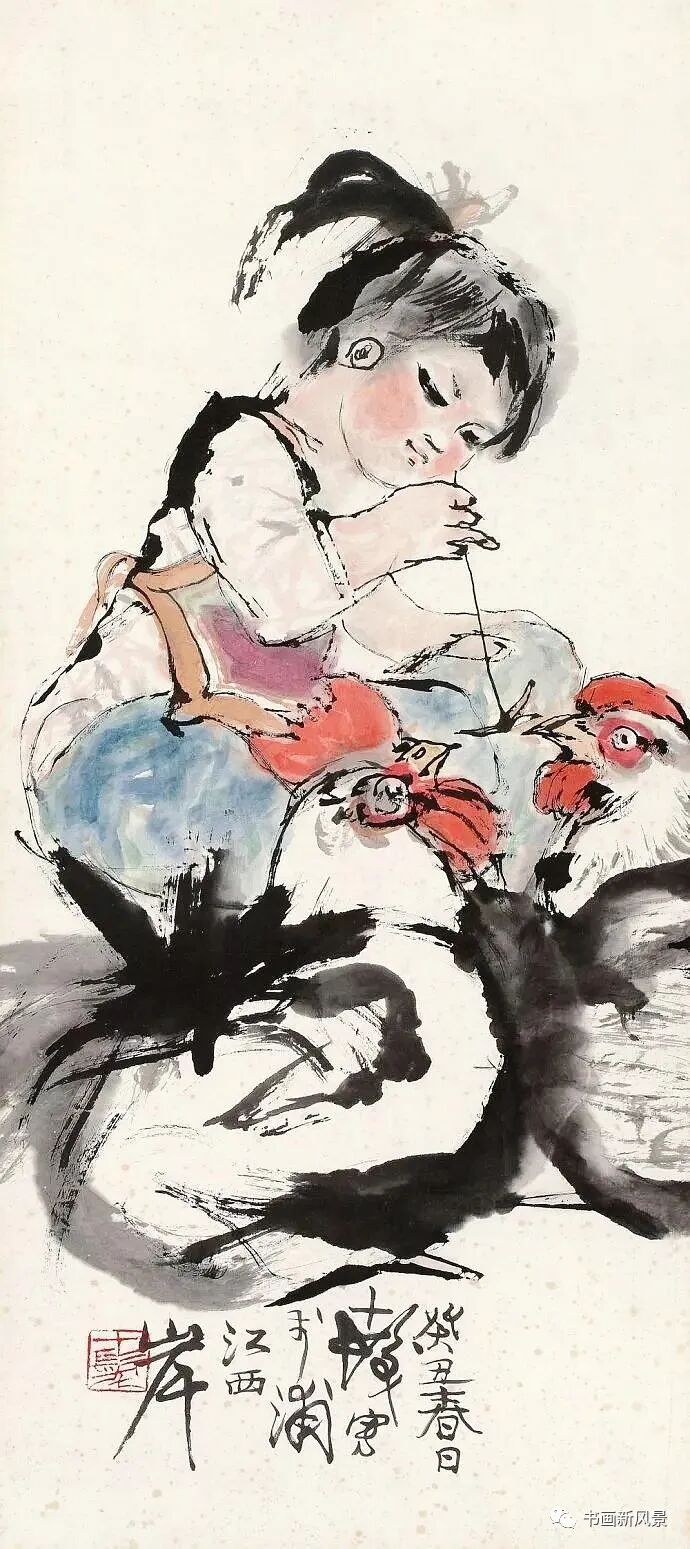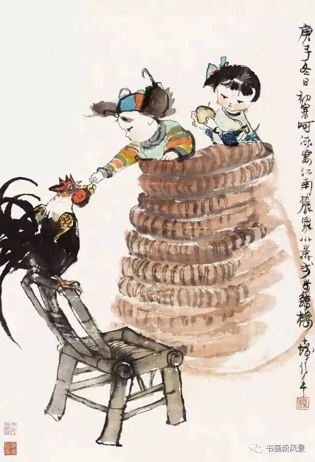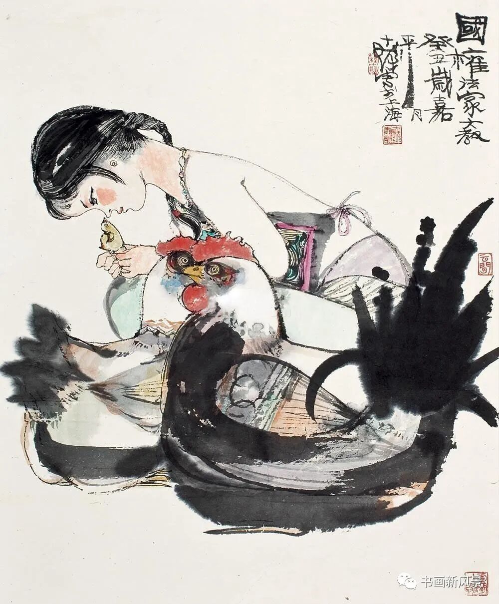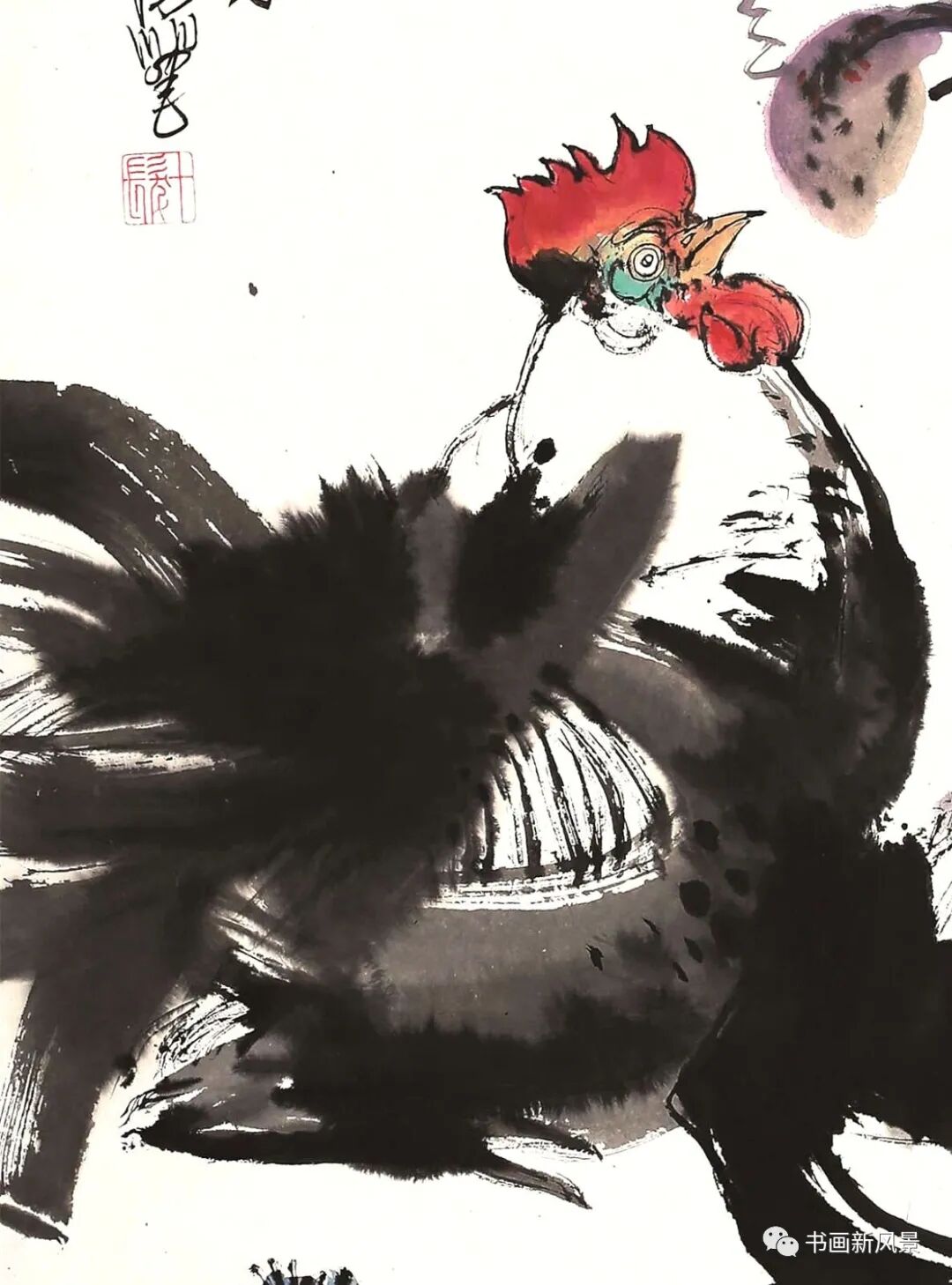 程十发很喜欢画鸡,他笔下的鸡,笔墨生动,夸张有趣。
