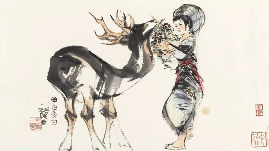 人物画巨匠程十发喜欢画鹿,简简几笔勾勒,再纵横涂几笔墨色,竟显得非常古朴。程十发的造型来自于秦汉,喜方不喜圆,再加上其生动的笔法,对物象高度的概括,使其在中国画大师云集的阵地里独树一帜。
