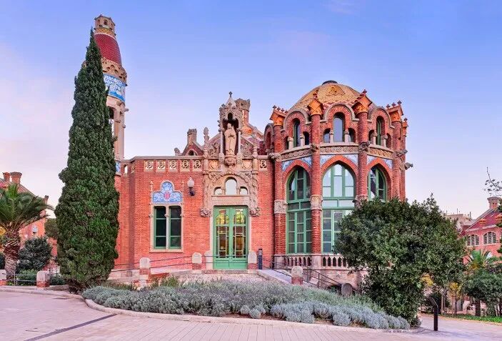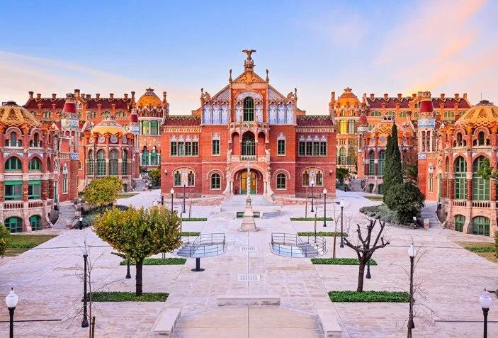 该医院由加泰罗尼亚建筑师Lluís Domènech i Montaner设计,诞生于城中之城,由色彩缤纷的大型亭台组成,通风良好位置优越,周围环绕着可以改善患者健康的花园。