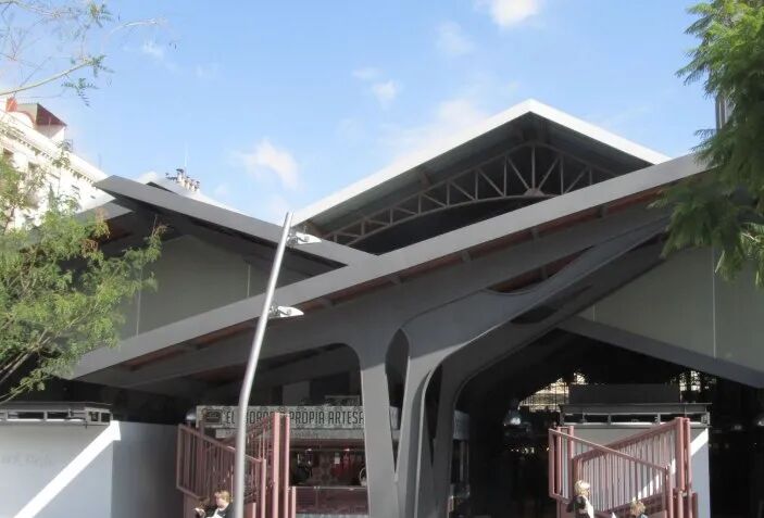 这是一个拥有百年历史的市场,传统上是在露天街道上非正式地组织起来的,项目由建筑师费尔明·巴斯克斯领导的b720工作室于2013年完成,主要目标是维护一个开放的特征,突出一个25米高的大屋顶。它的下表面产生了一个由多个破碎平面组成的屋顶,这些平面成为城市对市场内部的反射机制。