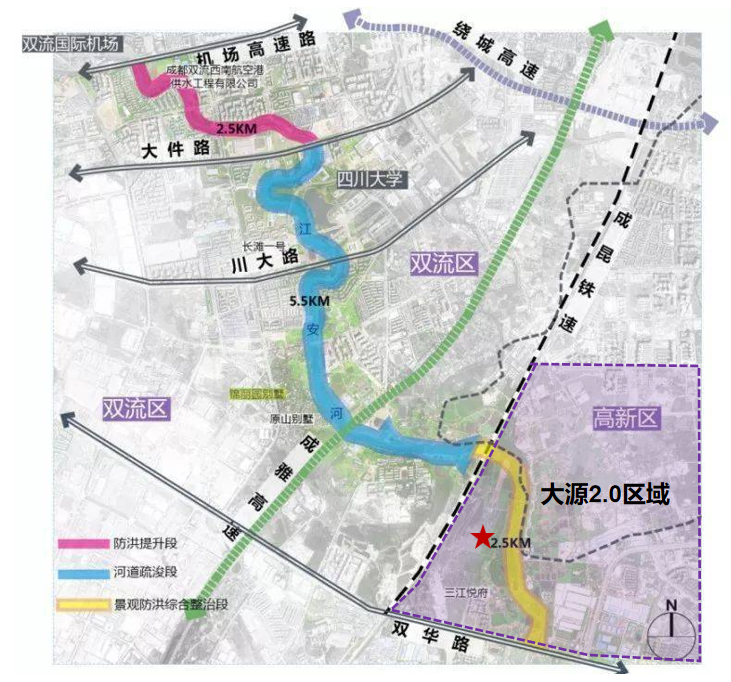 2020年中旬,长约10.5km的机场高速—双华路江安河治理工程开工。其中,长约2.5km的成昆铁路——双华路段作为江安河生态走廊,将再造大源2.0区域河堤两岸城市名片。