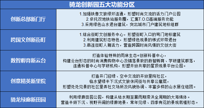 遵循生态、绿色、集约、共享、人文五大打造理念,围绕民乐TOD、占地约368.3亩的骑龙创新园,将被划分为创新总部新门厅、跨国文创新街町、数智孵育新云台、创意精英新里院、骑龙绿廊新田园五个功能分区。