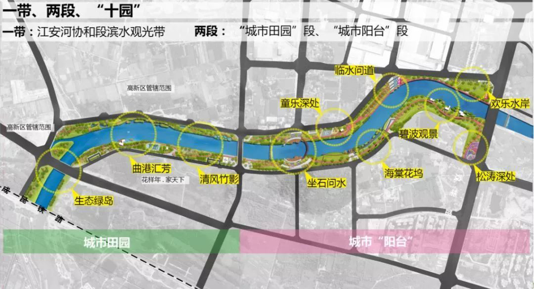 据悉,江安河生态走廊将按照“一带、两段、十园”的空间布局,将江安河协和段滨水观光带分为城市田园段、城市阳台段“两段”,并通过观景桥梁将“生态绿岛”、“坐石问水”、“松涛深处”等“十园”进行有机串联。