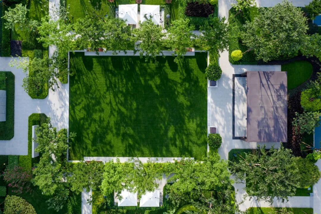 Neatly vegetation divides space into a community living room for people to socialize, receive a visitor and take short breaks. It is made of concise and unified stone ; Surrounded by the soft ground cover plants and bathing in the gentle light, people will be brought into tranquility and elegance by enjoying the cool, reading, chitchatting in the breeze and the greenwood shade.The landscape space with the orderly opening and closing is formed, with the extended lawn designed with the technique of "leaving blank space (Liubai) " as the green core.