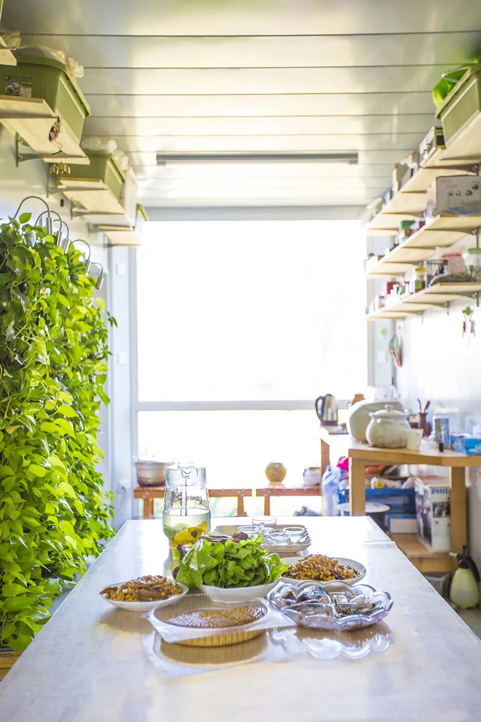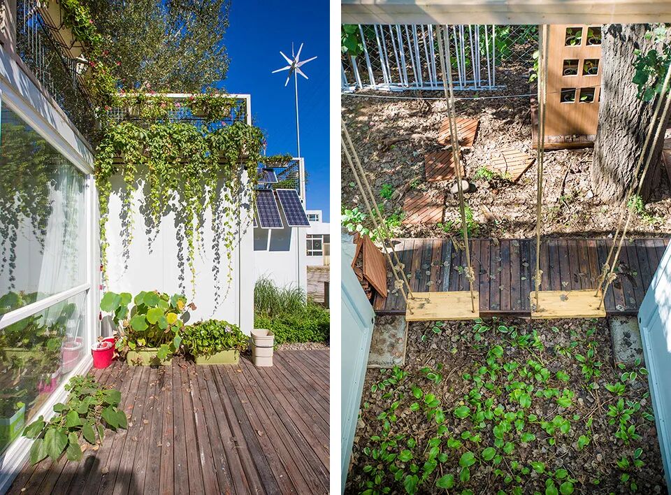 住宅外部的墙壁上是五彩斑斓的鲜花,门前土地里有刚冒出嫩芽的青草、蔬菜。屋里餐厅和厨房的一面墙壁上,挂着数十个小花盆,花盆里种着的生菜、韭菜、小葱和大蒜,自由生长,郁郁葱葱。