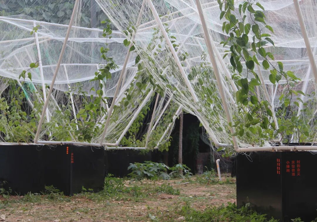 “天空农场”是VRAP未来乡土实践与研究工作室,基于城中村的生产复合型公共空间,对城市农业的探索实践。他们选用城中村随处可见的建材PVC作为装置主材料,设计了便于拆卸和运输的标准化结构。以“鱼菜共生“的方法来培养天空农场的植栽,通过九个”黑匣子“利用雨水收集得来的水饲养着几百条鱼,每个黑匣子里的”鱼粪营养水“通过一个低压水泵循环供给植物。