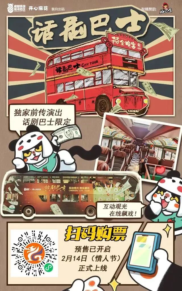成都双层观光巴士玩出新花样,与开心麻花超强IP联动,打造出首辆移动话剧巴士舞台,既能观光,又能看剧,还有地道川味美食,体验多元潮玩生活。