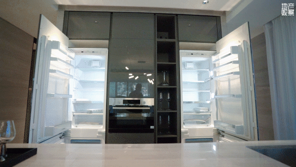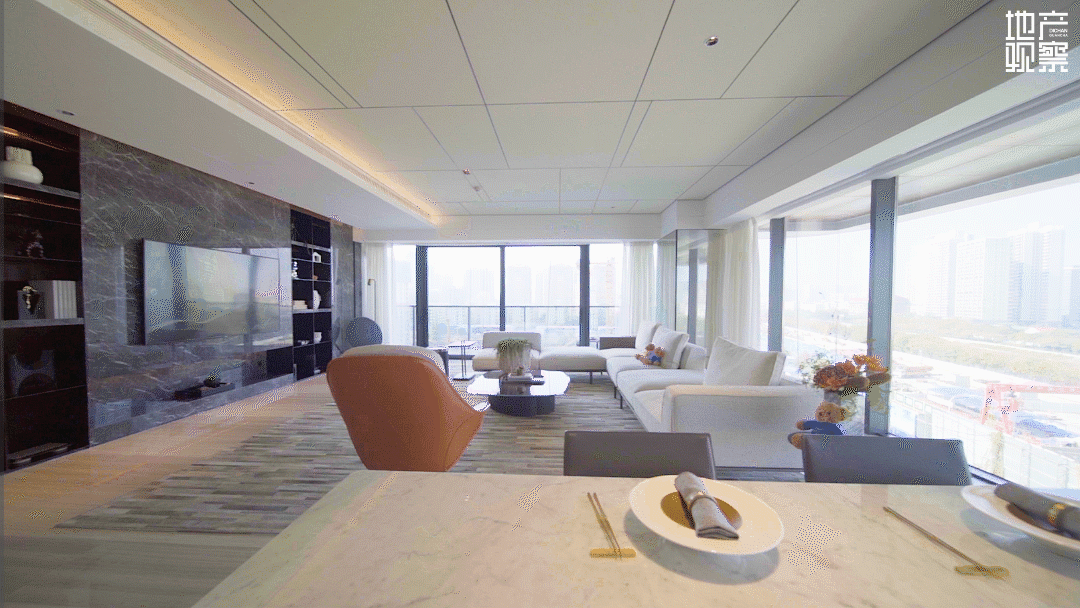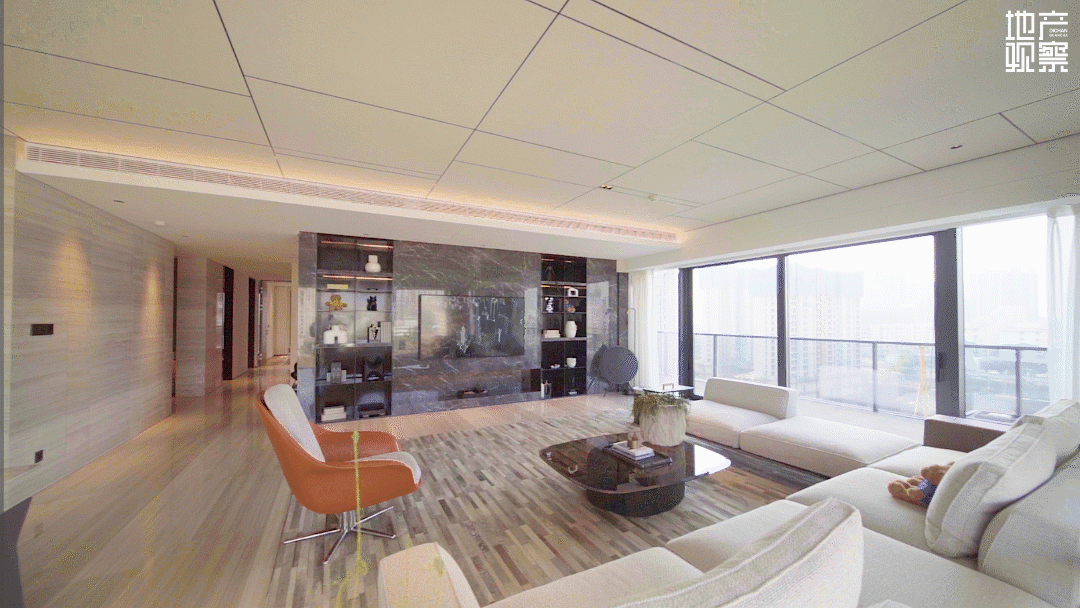 整个客厅双面全落地玻璃幕的设计,让整个客厅采光和视野无敌,而客厅的面积约80㎡