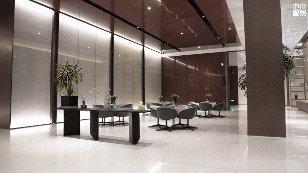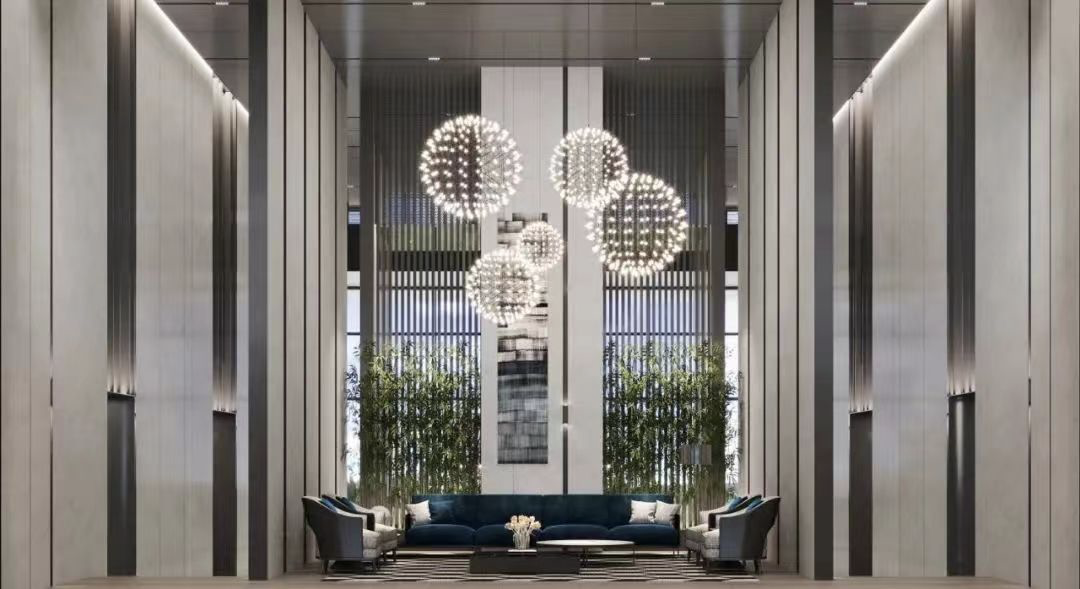 一层酒店式大堂,面积约230㎡,挑高达9米——为了最佳舒适度,项目打造中原挑高最高、空间最大的豪装酒店式入户大堂。用艺术格栅增加空间感,并设置会客区。