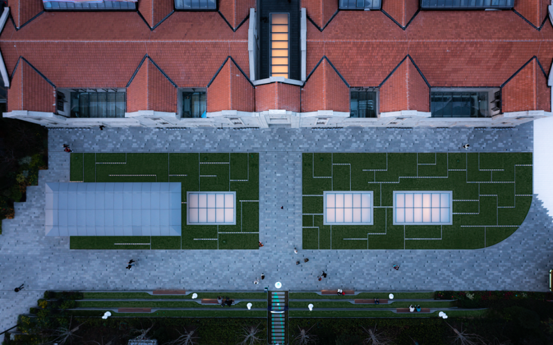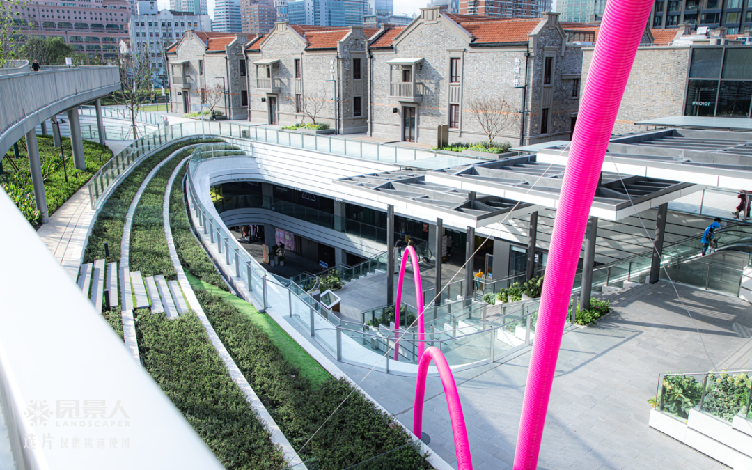 Shen Yuli Performing Arts Greenland is mainly used as a commercial outside pendulum and outdoor activity square. The landscape team fully respects the site culture. On the basis of the original site of Yuli, the traditional Shikumen culture of Shanghai is reproduced with modern design techniques, and part of the architectural style of Yuli is restored. And the other half of the Shen, in the form of earth art and the lawn green space integration. The flat shape of Shikumen is abstracted into patterns and inlaid in the green space, where the urban memory is retained here, and the urban context is continued and developed here.