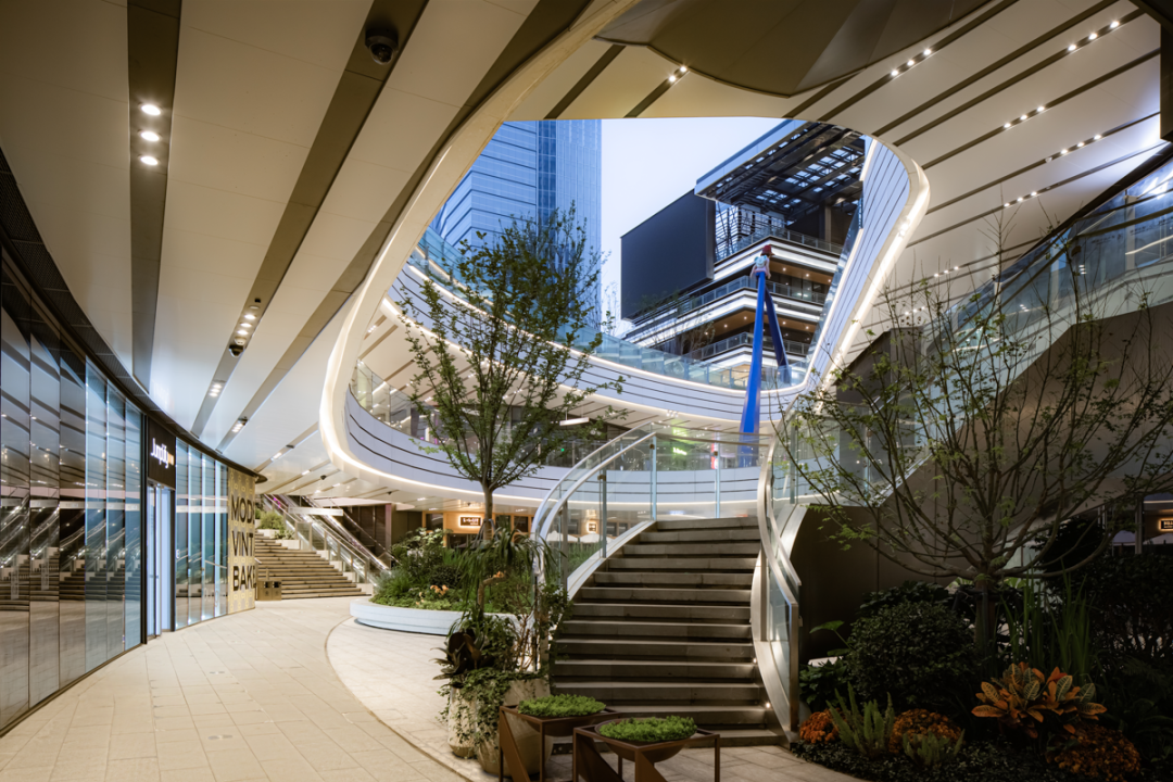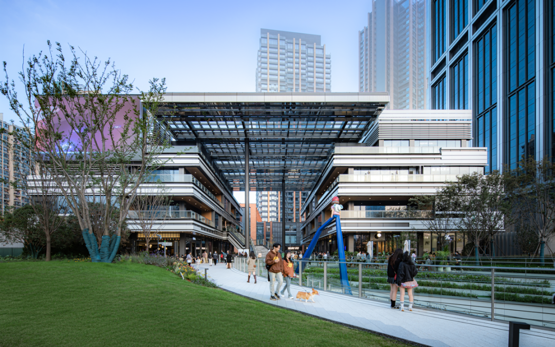 上海苏河湾万象天地作为一个网红项目,“城市峡谷”的设计理念,又或者说项目极具说服力的天空视角,毫无疑问已经获得了广泛的认可。两层地下商业空间嵌入“峡谷”之中,“峡谷洞口”的边缘通过层层退台的地景设计与地面绿地相连。场地空间的丰富度和立体性,哪怕只是通过朋友圈的分享,也让人过目难忘。