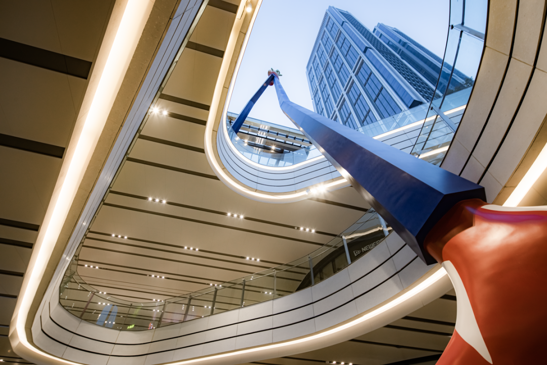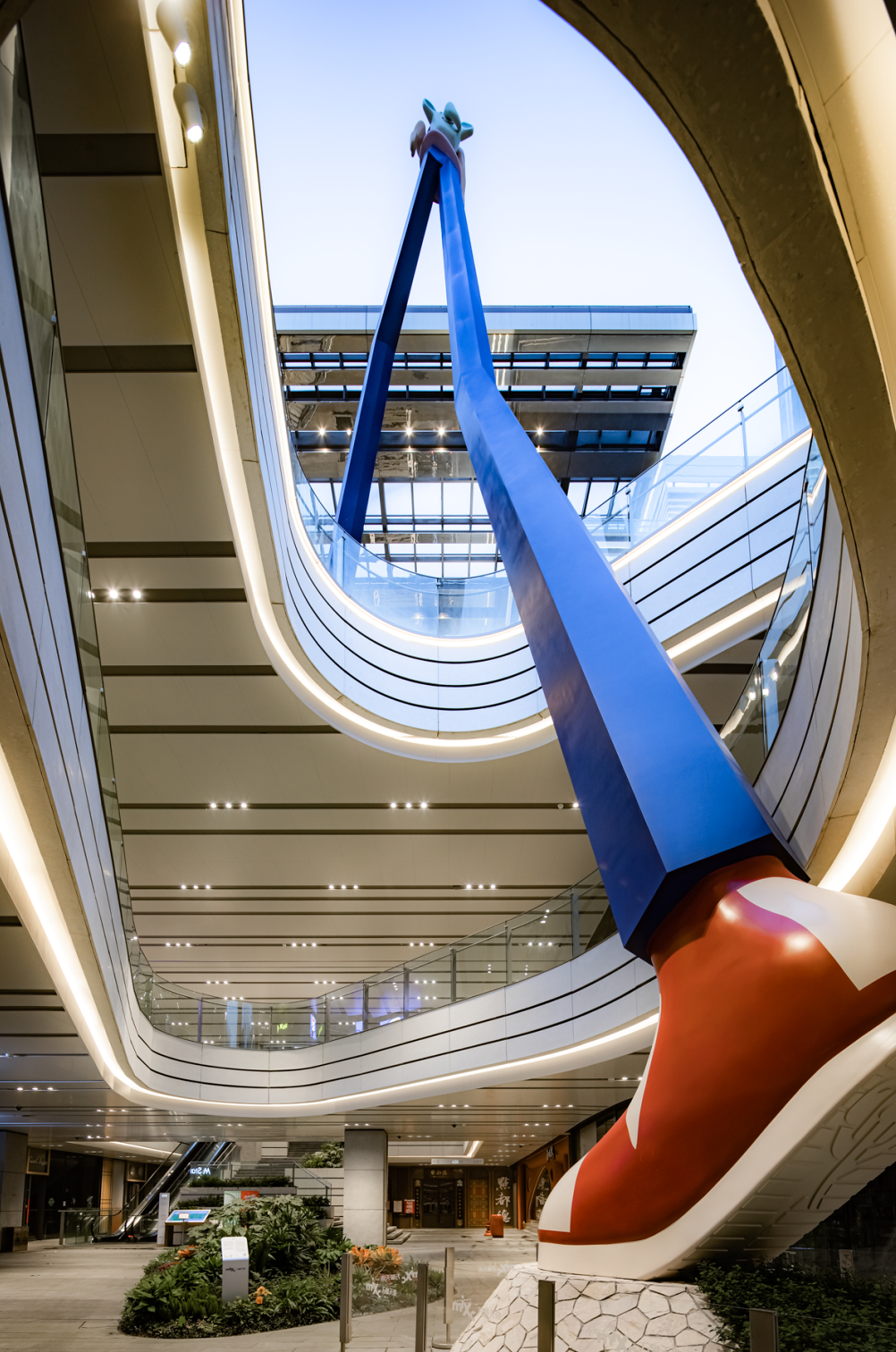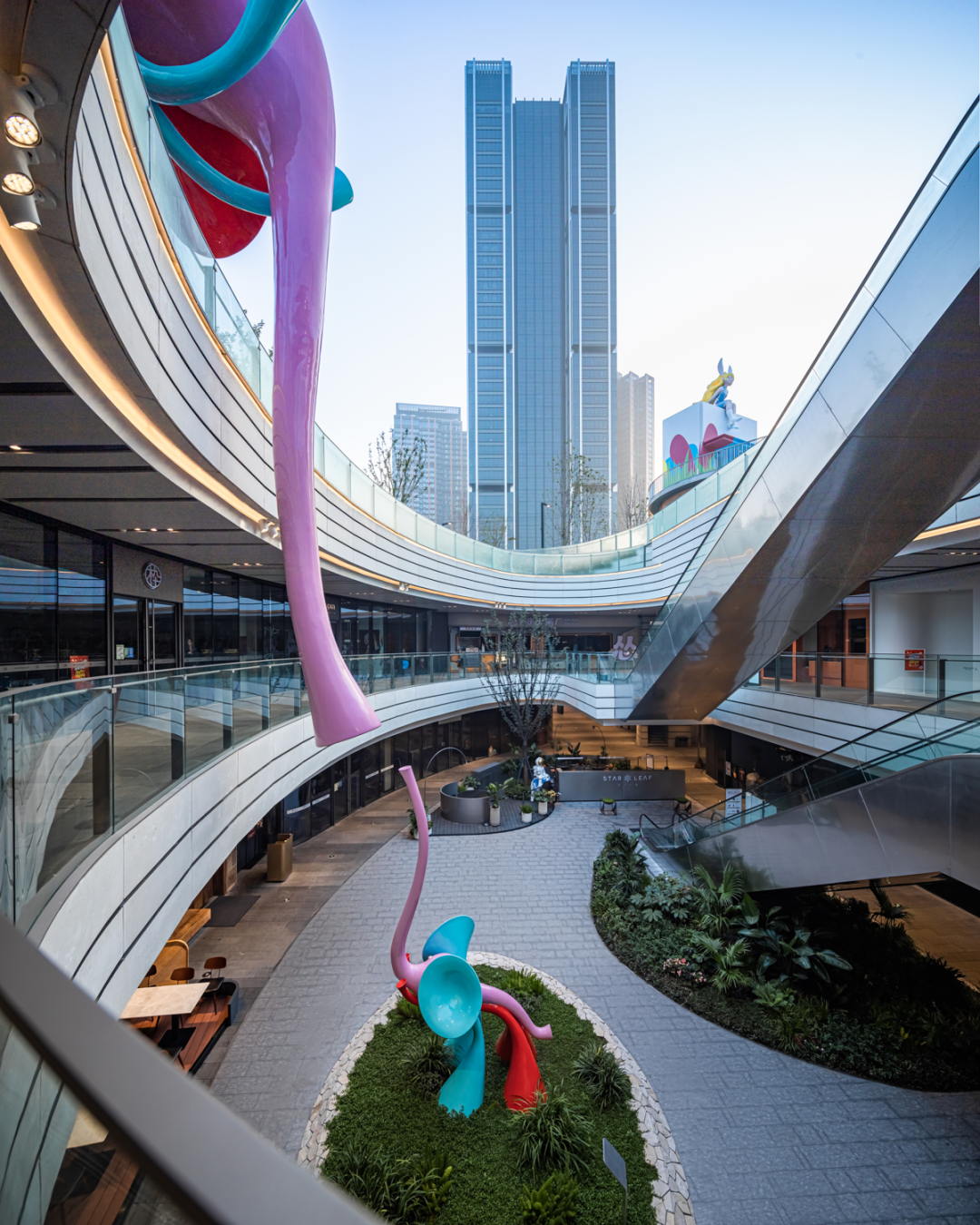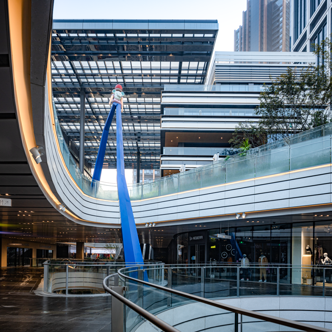 Another sculpture, " Go!"To imitates a child walking through the green space to the street, the hero's long legs across the two-story commercial canyon to the terraced landscape on the ground. The creativity of the artwork highlights the penetration of the ground green space and the underground commercial space.