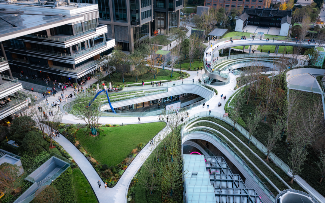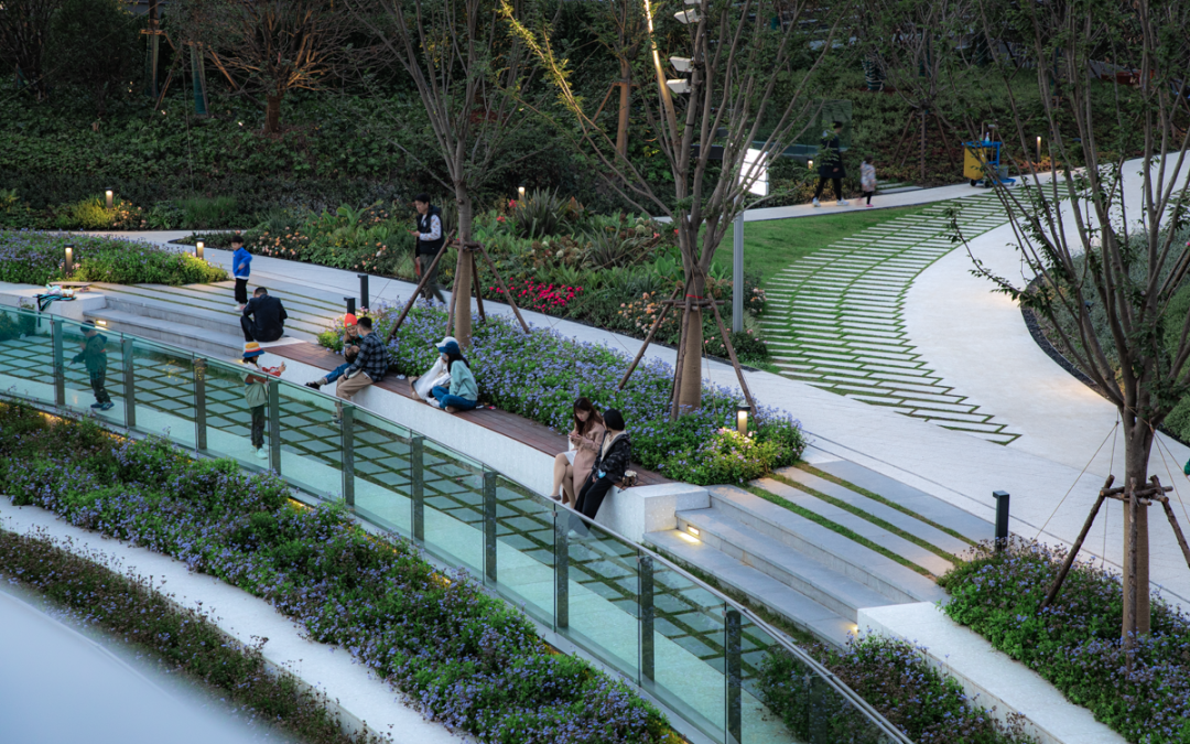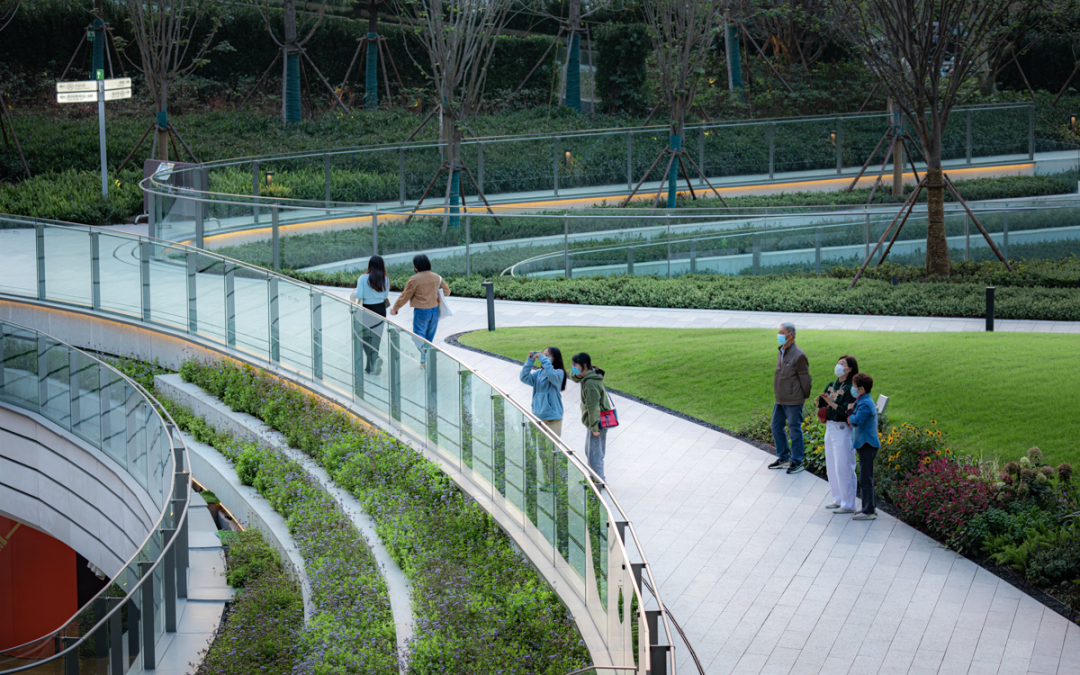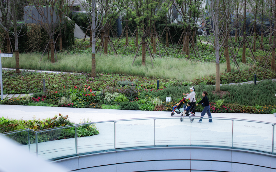 流线型的道路、种植系统与地面开口形成对话,精心布置的花境在城市公园中创造出自然野趣。线性的连桥衔接城市与滨水,丰富步行体验,从空中激活整个场地。横跨东西地块的天桥创造出富有变化的尺度与空间层次,步行其上可以感受到扑面而来的苏州河两岸自然与城市景观。梯田式台阶将公园的自然从地面层引入地下,通过多元的植物设计,丰富空间体验,激发商业的生机与活力。精心设计的艺术装置在视觉层面引导了垂直动线,将人们从开阔的地面引入地下开放式商业,探索其内在魅力。