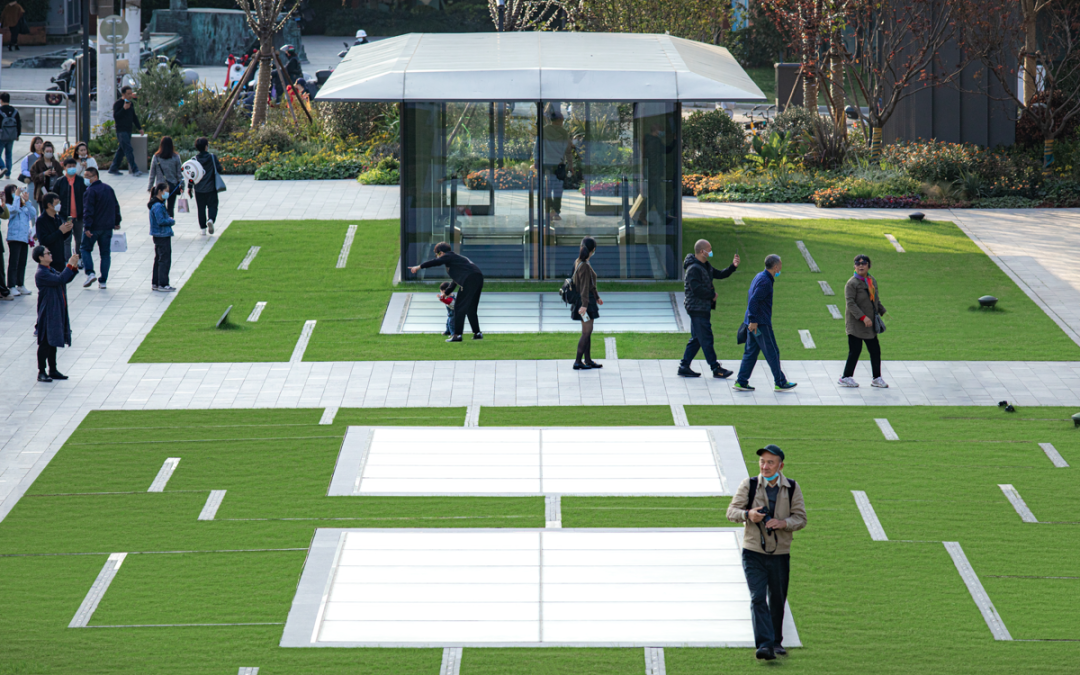 The sunny lawn on the site is actually an apron that meets civil aviation standards.On the one hand, the design is to meet the requirements of green rate in commercial space.On the other hand, it is designed to meet the participation and interactivity of the space. And the permeability of the grass and pavement, greatly increased the difficulty of paving. Need accurate wiring, and accurate stone, to be achieved.