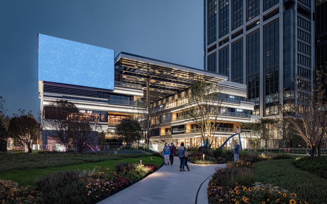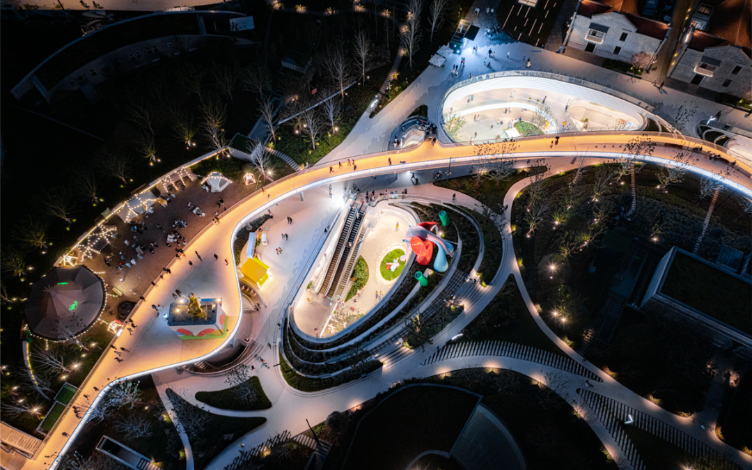 The lighting design of the site reflects the core structure of the whole project, integrating a variety of functions into a powerful floating halo through a circular light belt. In addition, several terraced sunken Spaces, using the gradual lighting effect, and the sequential lighting on both sides of the surrounding garden trails, together form a "nebula" like night view map.