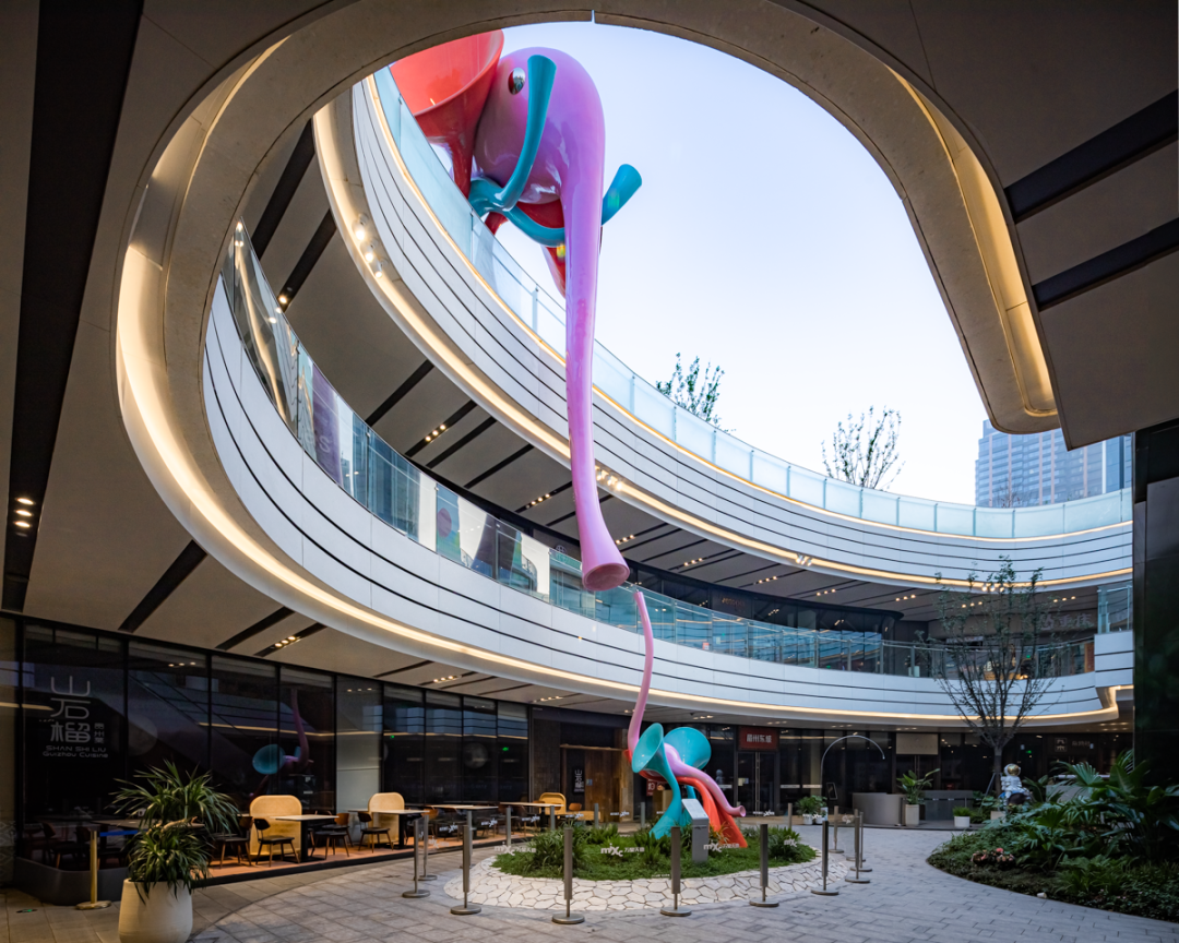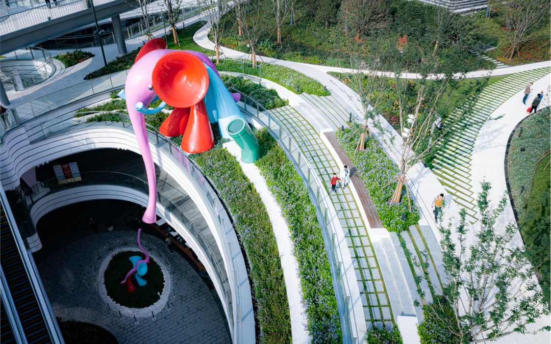 除了采用自然植物手法,下沉空间场地还采用极具识别度和剧情感的母子象雕塑设计点缀了空间。雕塑由香港创意工作室AllRightsReserved携手德国艺术家IngesIdee创作了两件雕塑作品,进一步洞穿了商业与绿地的峡谷空间:“大象亲子乐团”是两只一大一小的卡通象雕塑相互对望,将地上绿地与地下商业连接起来,以喇叭与低音号为创作元素,其流线形态与洞口的弧度相呼应。
