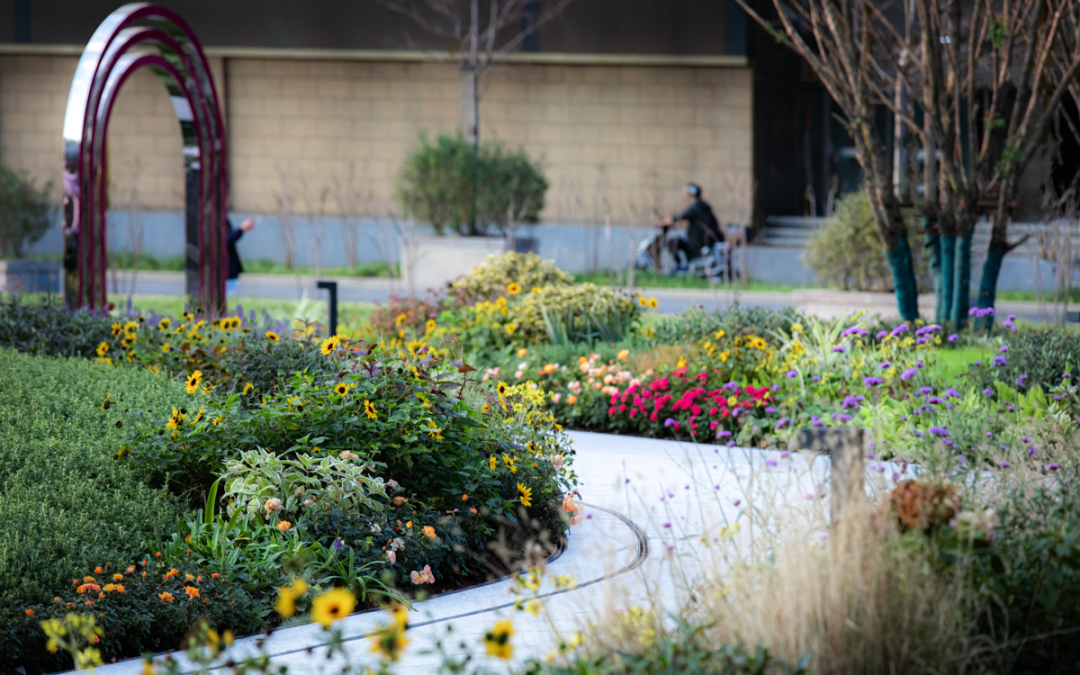 The natural healing garden in the commercial public space makes the visiting line itself one of the destinations. Through the smooth arc path, the natural healing space of multiple different atmosphere is connected, bringing different interactions and sensory experiences to the viewer. Along the trail garden, a continuous line of lines links the visitor and the sensory experience.The rich variety of natural flower land not only reflects the designer's unique plant collocation design, but also reflects the high maintenance cost of the site.