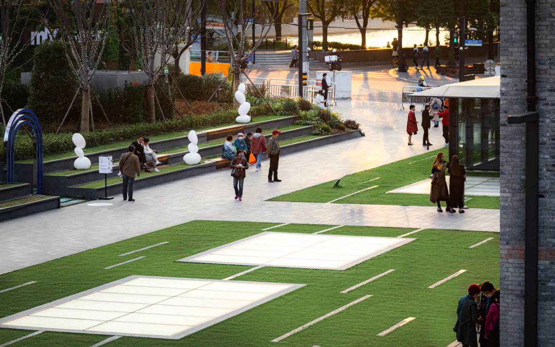 慎余里演艺绿地主要作为商业外摆和户外活动广场使用。景观团队充分尊重场地文化。在慎余里的原址基础上,以现代的设计手法再现了上海传统的石库门文化,部分复原慎余里建筑风貌。而另一半的慎余里,则以大地艺术的形式与草坪绿地相融合。石库门的平面形状被抽象成图案镶嵌在绿地之中,城市记忆在这里被保留,城市的文脉在这里得到延续和发展。
