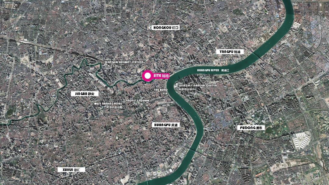 Suhewan Park is in the core of the Suzhouwan area and adjacent to the Suzhou River, the mother river of Shanghai. It is closely connected to People's Square and the Bund, which are the development focal points of the Jingan District. The city's main road intersects the site, dividing it into east and west two parts.