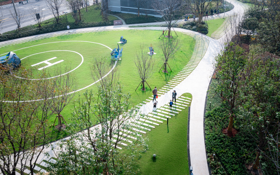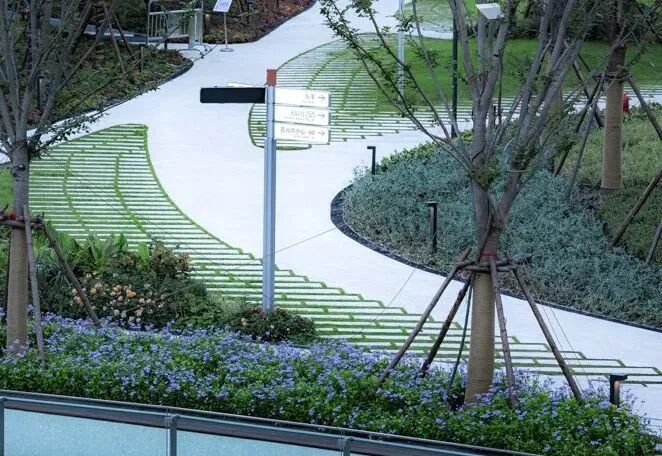 The sunny lawn on the site is actually an apron that meets civil aviation standards.On the one hand, the design is to meet the requirements of green rate in commercial space.On the other hand, it is designed to meet the participation and interactivity of the space. And the permeability of the grass and pavement, greatly increased the difficulty of paving. Need accurate wiring, and accurate stone, to be achieved.