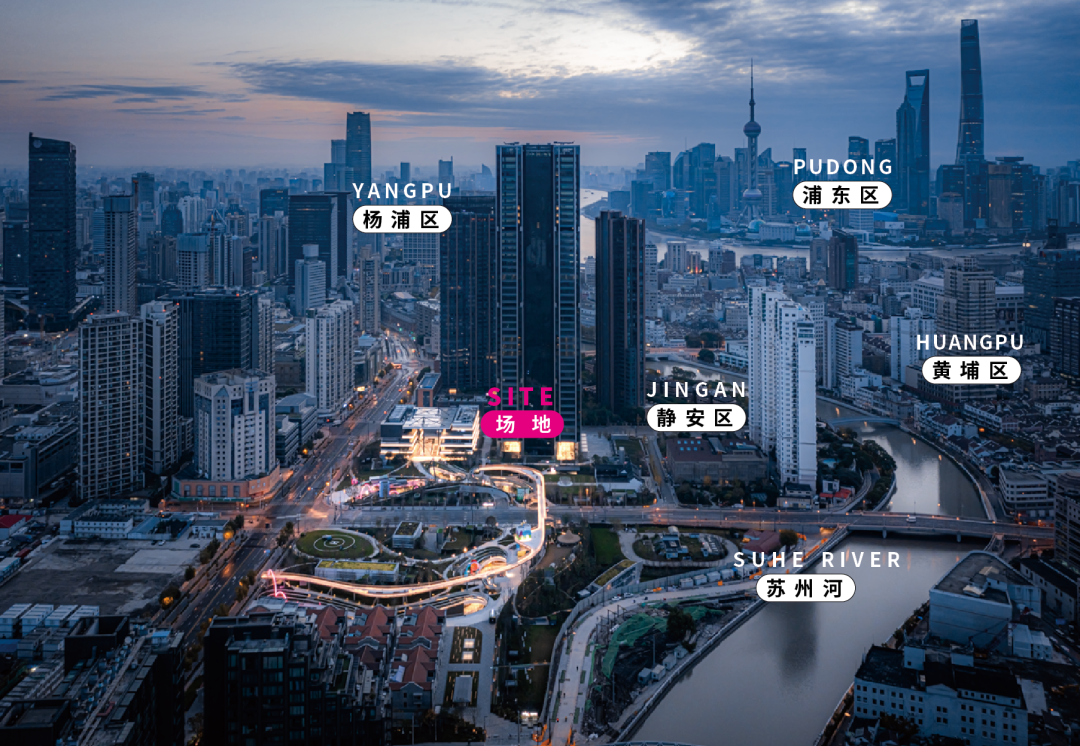 苏河湾万象天地(苏河湾中央公园)紧邻上海母亲河苏州河,是苏河湾片区的核心区域,与周边南京东路人民广场、外滩联系紧密,更是静安区未来发展的重点。城市主干道横穿场地,将其分为东西两个地块。