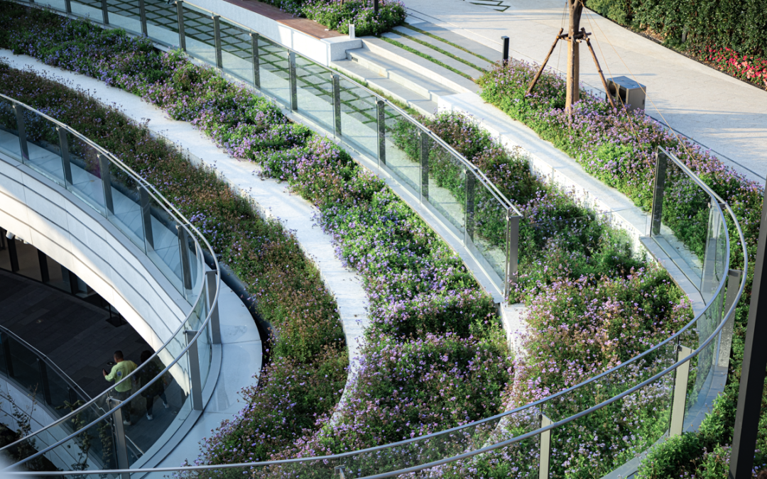 流线型的道路、种植系统与地面开口形成对话,精心布置的花境在城市公园中创造出自然野趣。线性的连桥衔接城市与滨水,丰富步行体验,从空中激活整个场地。横跨东西地块的天桥创造出富有变化的尺度与空间层次,步行其上可以感受到扑面而来的苏州河两岸自然与城市景观。梯田式台阶将公园的自然从地面层引入地下,通过多元的植物设计,丰富空间体验,激发商业的生机与活力。精心设计的艺术装置在视觉层面引导了垂直动线,将人们从开阔的地面引入地下开放式商业,探索其内在魅力。
