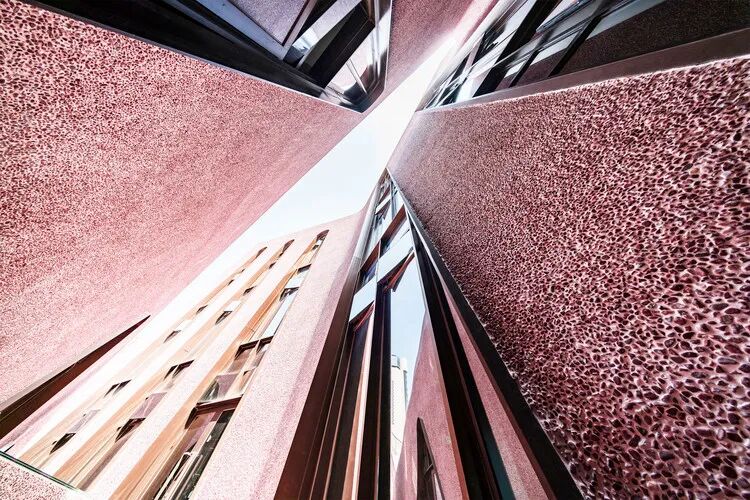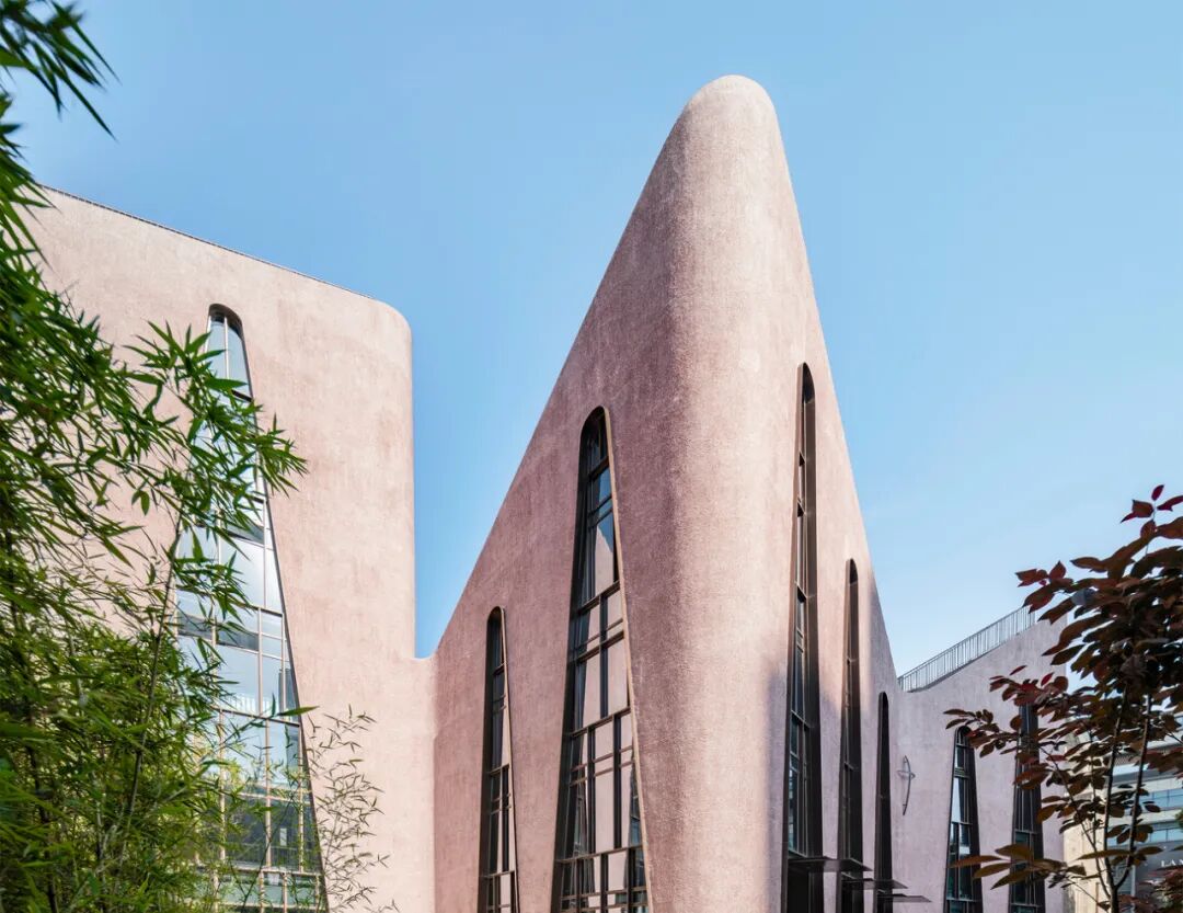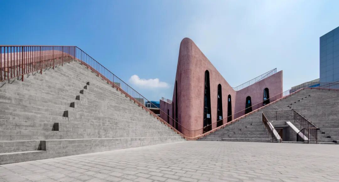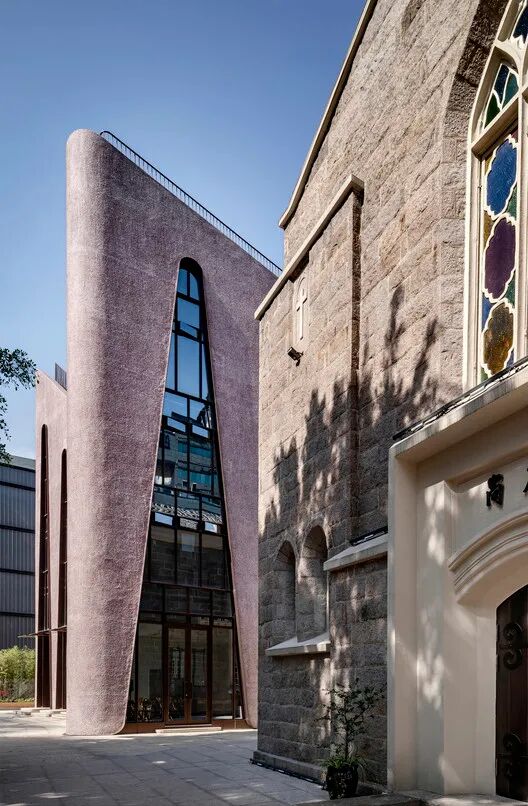 “新堂”的外墙与其高光泽感的幕墙形成了刻意的反差,由红色花岗岩制成,与“老堂”的表皮使用了视觉相似的石材,捣滚成光滑的小石子,再采用网粘石的手法平铺在外墙上,使这种曾用在本地典型乡土建筑上几乎完全被遗忘的老手工艺又复苏了起来。