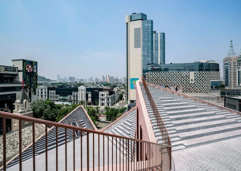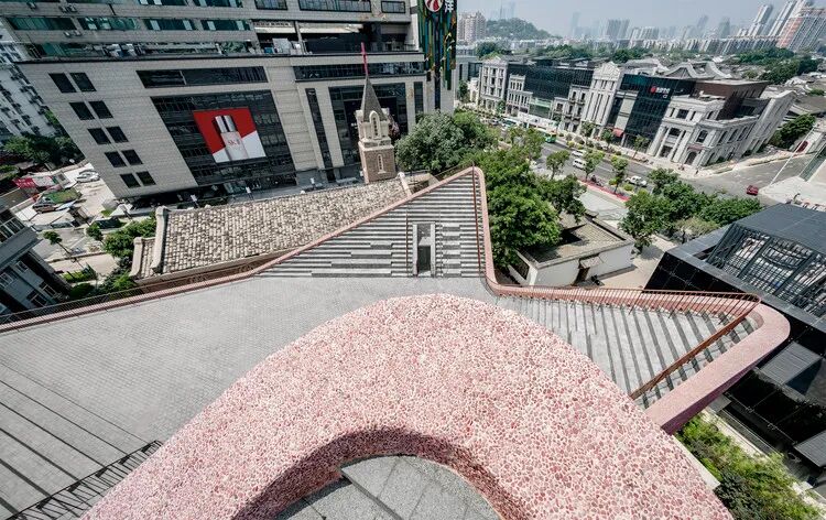 该项目用其设计说服了业主和主管部门:通过自身的过度,来化解城市建设过程中的失衡。竖向设计时用了不间断的上下起伏来塑造轮廊,并在视觉上碎片化其体量,在比例上使其得以隐藏掉实质上比花巷老堂这座历史建筑大了七倍的“新堂”。