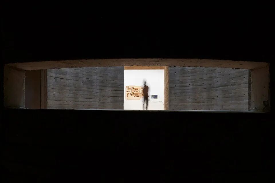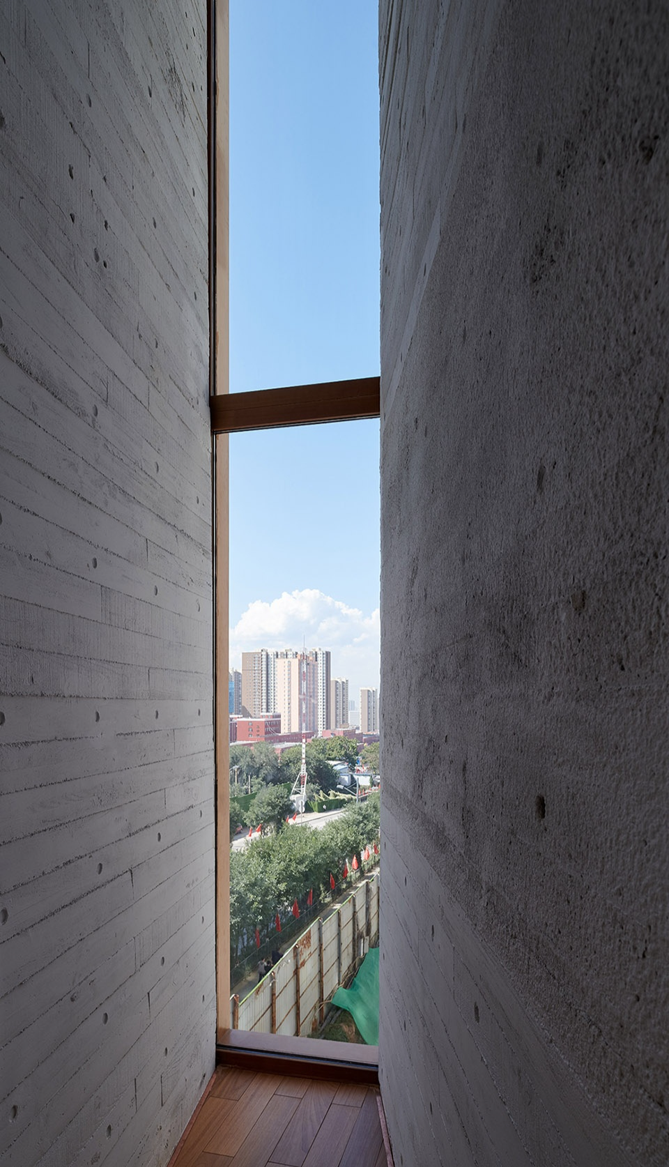 在展览空间内,自然光经过天窗柔化过滤,再透过1.9米见方、1.9米深的井字梁格构渗入展厅,形成一种匀质的、笼罩性的光线。连接二层与四层的外挂楼梯、内院的角窗、四层展厅西南角的竖向开缝,为沉浸于展览当中的人们提供了回眸城市的瞬间。