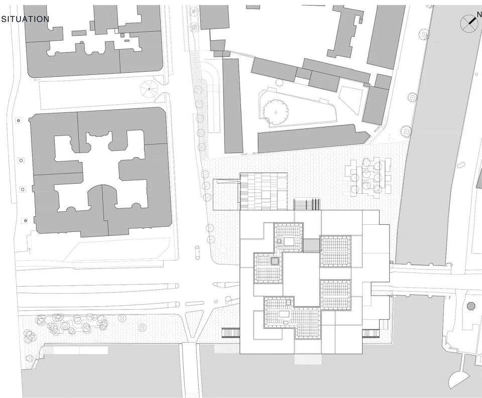 其次,该场地的孤立特征:四面都是障碍物决定了从附近的公共街道上只能看到上层。第三,新建筑紧邻其历史建筑,在一系列不文明的建筑高低,现代与传统,东方与西方之间,要求对新旧建筑的关系采取明确的态度。