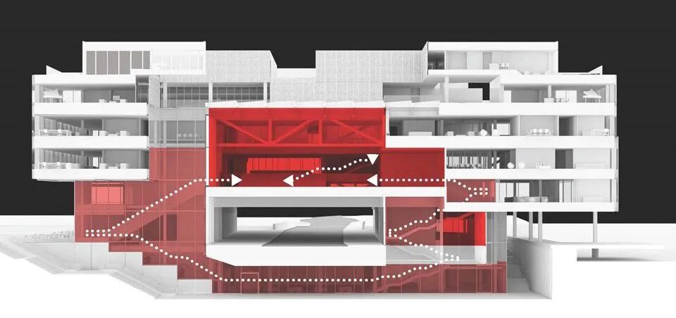 丹麦建筑中心本身构成了BLOX的核心,处于建筑的中央位置,其周围穿插环绕着住宅、办公室和停车场等功能区域。整个建筑的空间沿着纵向的序列排布,从地下一直延伸至楼顶的咖啡馆,在此可以欣赏到整个哥本哈根的美景。