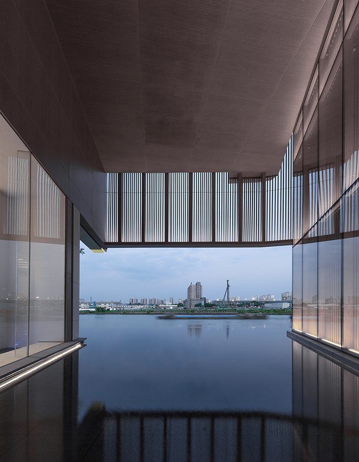 两侧室内区域设置无边框长条宽荧幕大窗,将运河及对岸城市景观纳入框景,充分利用了运河资源。沿河展开的室内界面错落灵动,步移景异中可走出室外,深入贴近滨河场景。