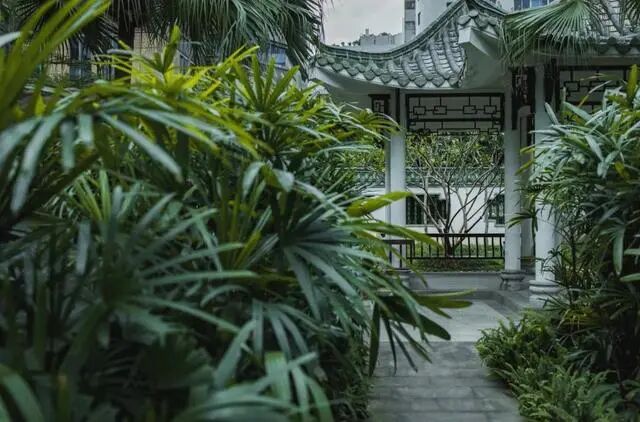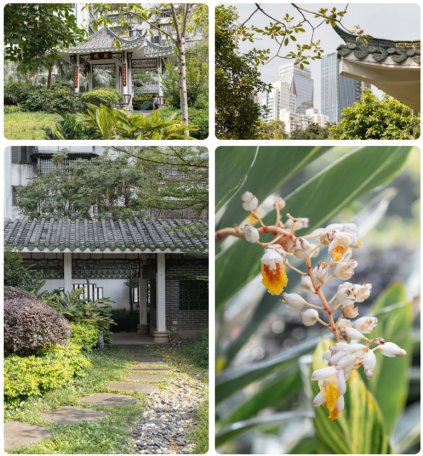 公园是半开放式设计。虽然没有门来阻挡它,但另一边是用墙与其他建筑隔开的。墙壁涂有白色油漆和墨绿色砖瓦屋顶。墙后的树木高低错落,仿佛要越过墙,把树枝伸进公园,来窥一隅园里的风景。围墙沿线的草坪比其他地方的草坪更厚、更高。公园里的长廊有绿色的砖飞檐和古色古香的栏杆。走在长长的走廊上,你似乎会在梦中穿过古老的景色。也许穿着飘逸的汉服拍照是一幅古老的诗意画卷。公园里还有两座诗意的亭子,不远处的高楼大厦却充满了现代气息。这两种风格的建筑被放置在同一个镜框中,产生了强烈的对比,又说不出的协调。