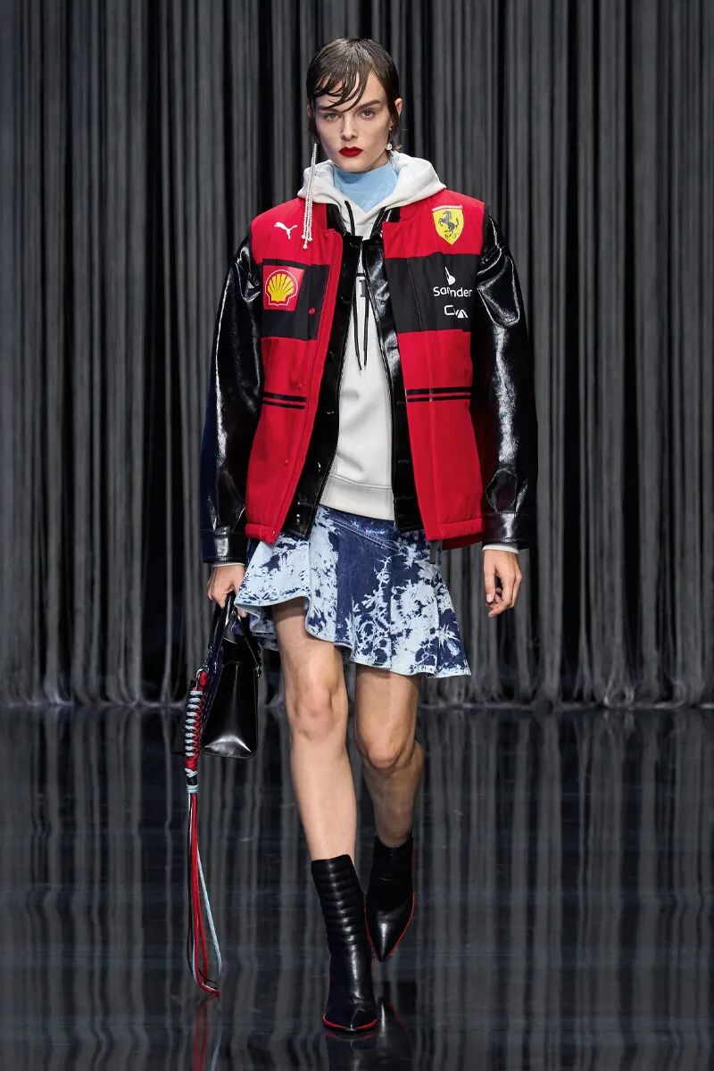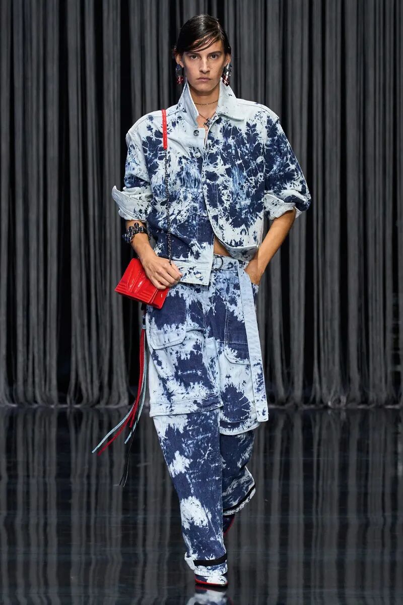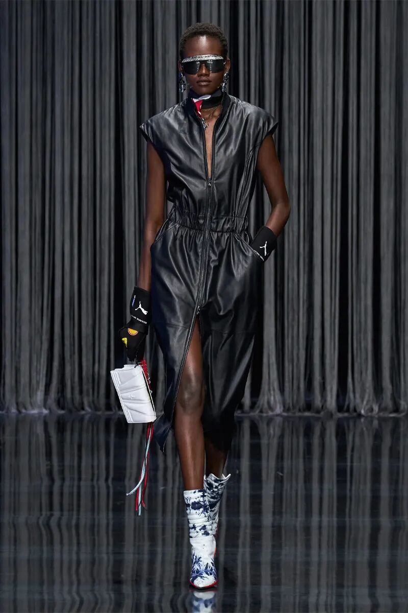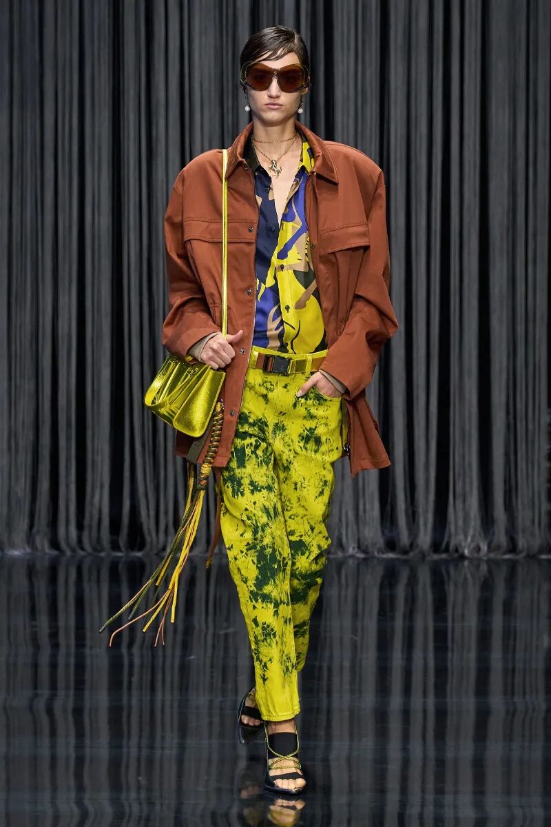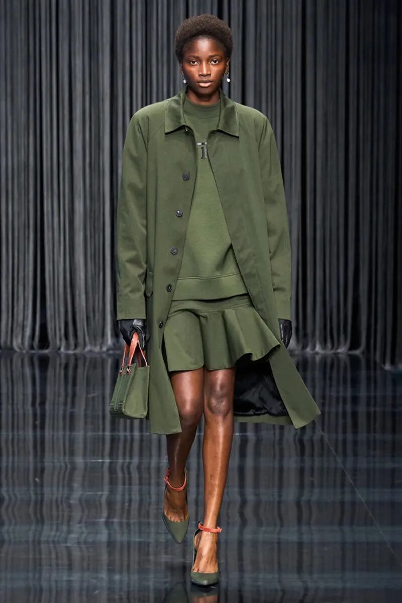 整体橄榄绿色的造型带来了工装机能风格,也凸显了服装绝妙的质感。