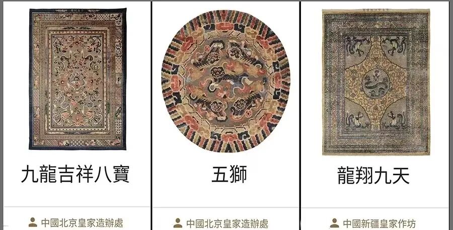其中最具代表性的,就是常年展出在美艺大堂里的这28张清代御制地毯藏品,包括极其珍贵的中国北京皇家造办处出品的《五狮》,和乾隆皇帝御用过的、由新疆皇家作坊出品的《龙翔九天》等保存完好的清代地毯。