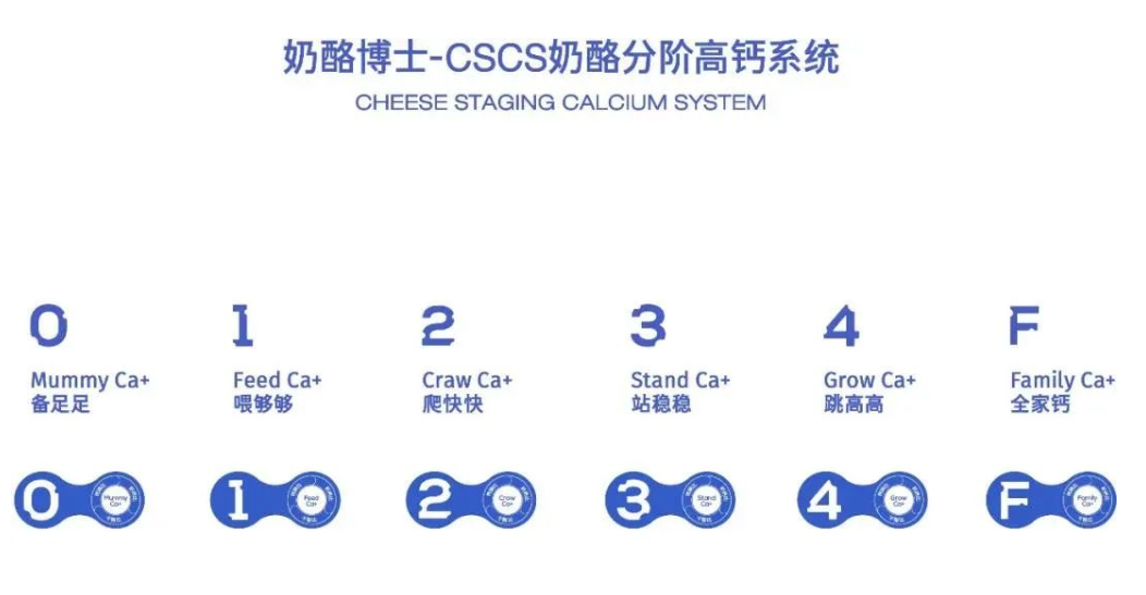 尽管初步奠定“江湖地位”,奶酪博士作为新秀品牌,撼动妙可蓝多等巨头并非易事。为夯实差异化竞争优势,奶酪博士在2021年11月进行品牌升级,将受众聚焦于0-6岁宝宝,提出奶酪博士CSCS奶酪分阶高钙系统,并构建统一的视觉体系,希望将自身打造为“分阶奶酪专家”,以专业品牌的身份,对抗妙可蓝多等行业领导品牌。