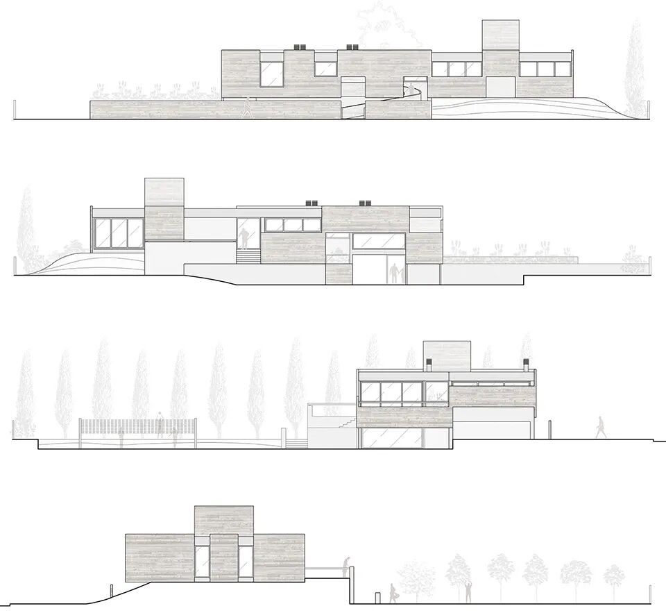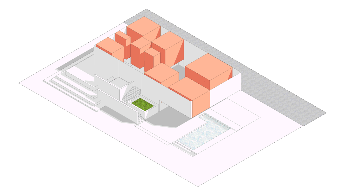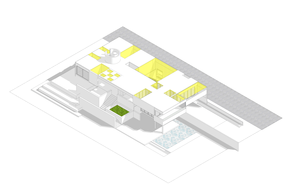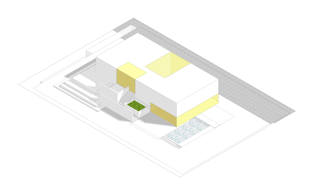 由于基地本身的起伏高差,住宅东侧抬高1.3米,后院的主要入口置于二层,开辟处入口庭院,作为室外客厅。