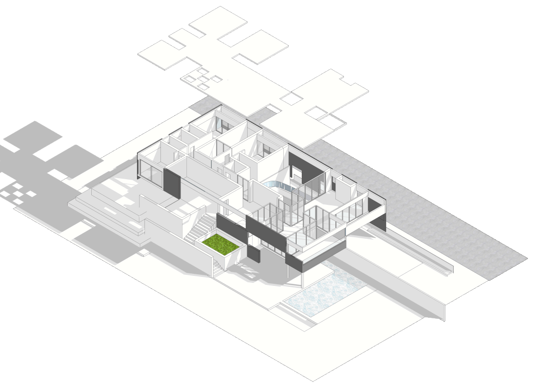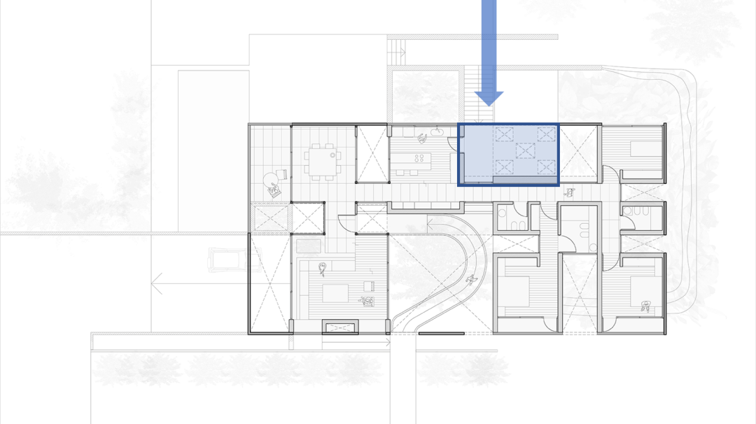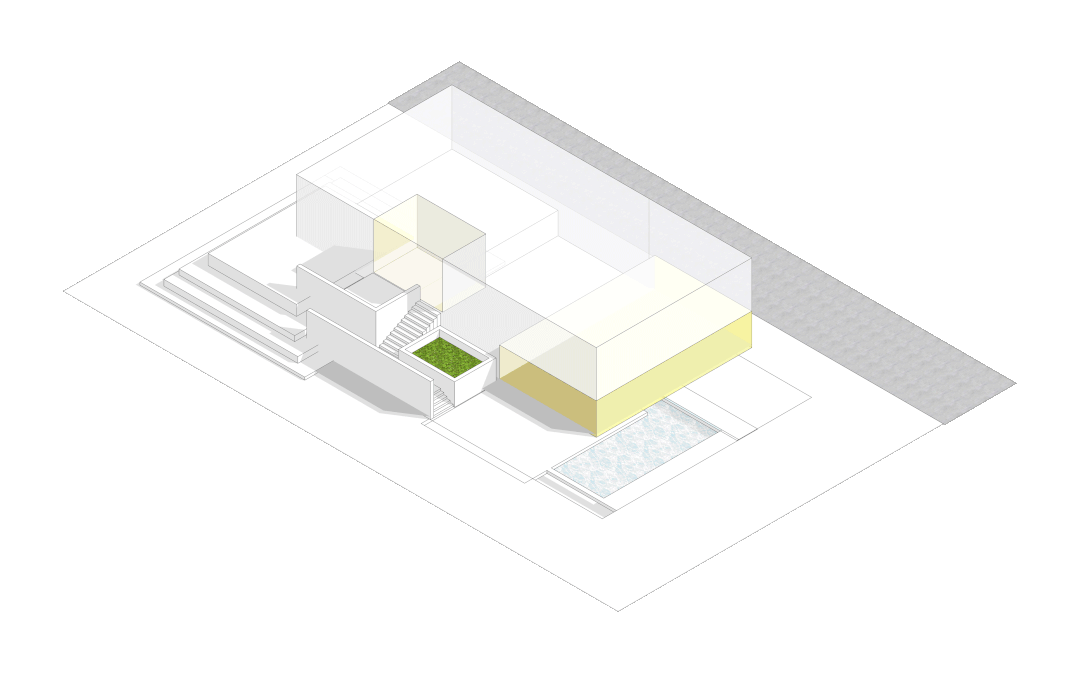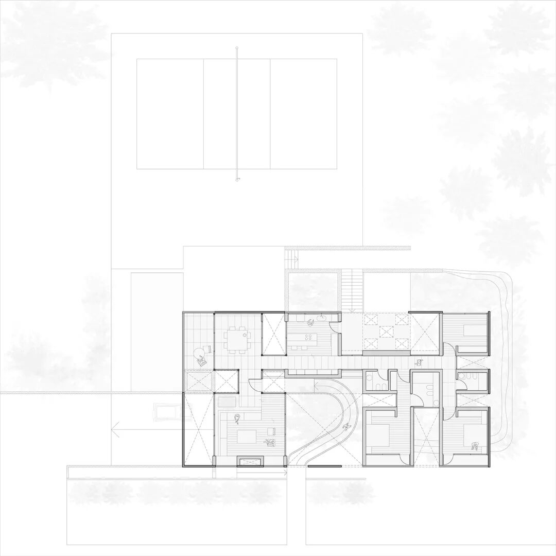 而另一部分一层的空间,同样对外开放,在空间关系上与后院的景观互相渗透,泳池旁的灰空间用作休闲。