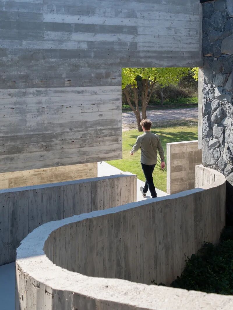 面向公路的正立面,一副冷冷淡淡生人勿近,大面积的片墙挡住了庭院,只留下一个狭窄的入口。经过不显眼的洞口,再到开敞的庭院,从弯曲的廊桥进入室内,人可以感知到欲扬先抑的空间变化。