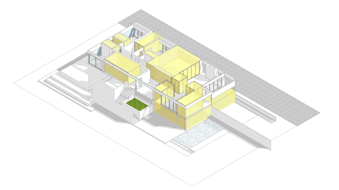 在与外部的联结中,建筑一层有两个入口,主入口与台阶相接,在登上台阶后便可以到达入口的平台。