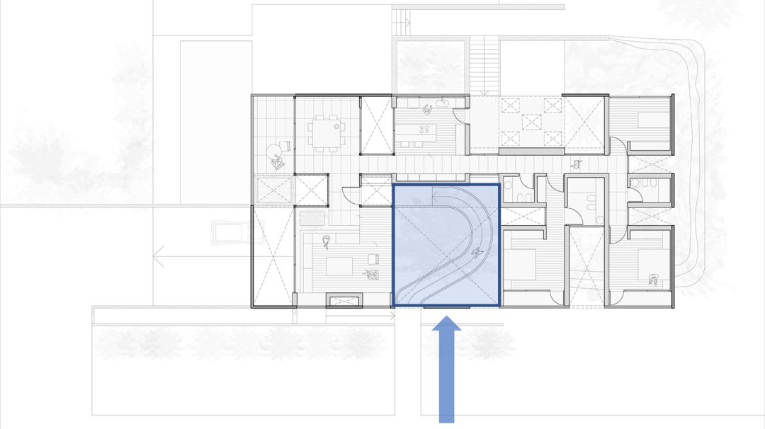 次入口与庭院相接,在进入前需进入弯曲的坡道,在穿过庭院的同时逐步进入住宅。
