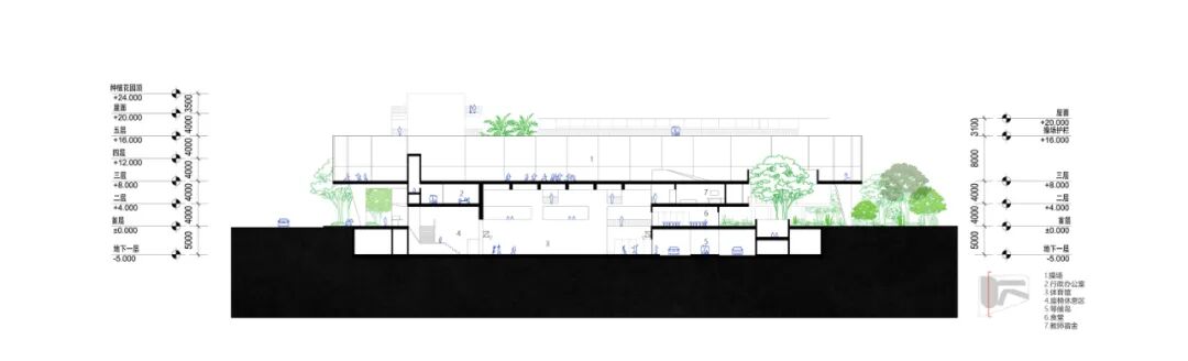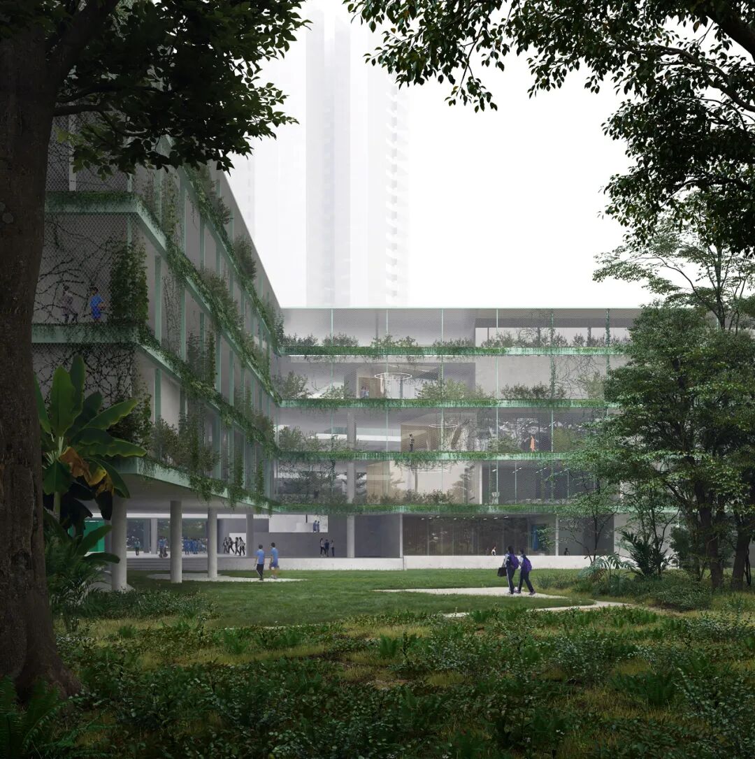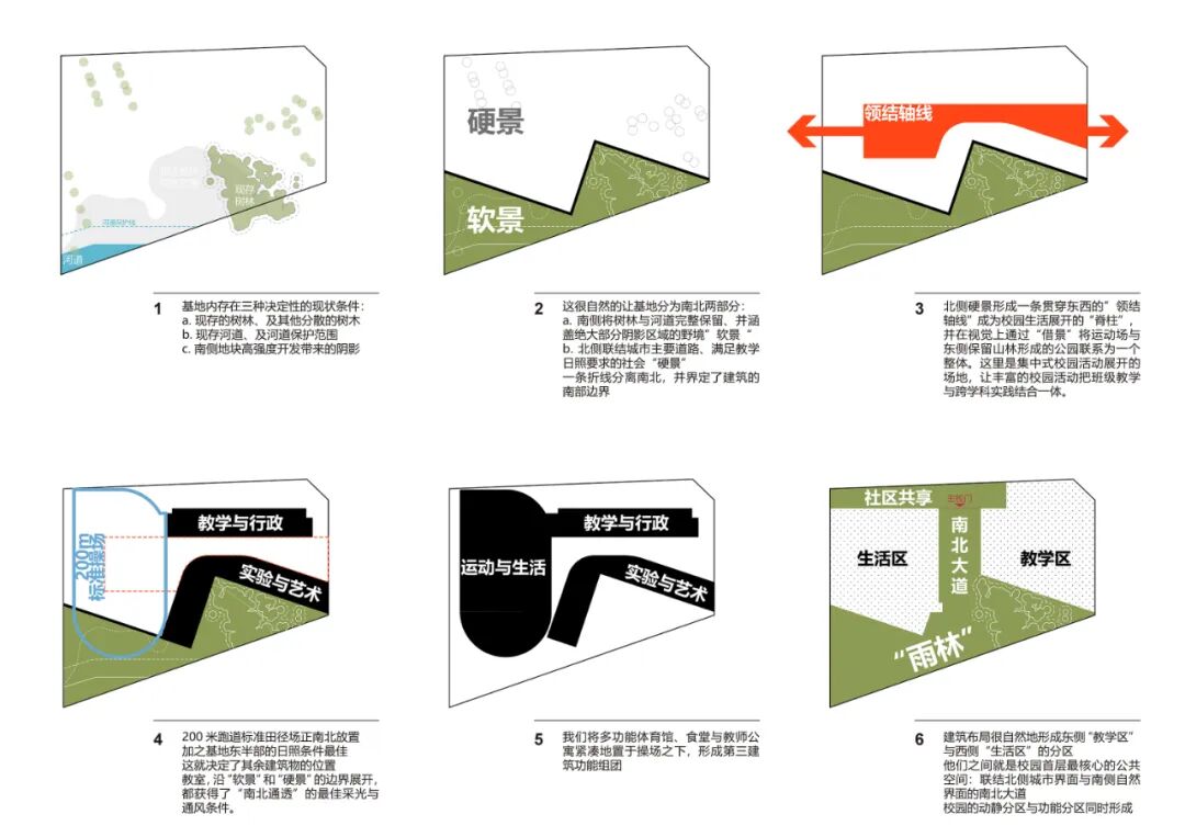 于是一条“Z字形折线”根据教学空间所需条件的优劣,巧妙将基地划分为两部分:南侧软景(自然)与北侧硬景(教学)。所有人工构筑物都坐落于“硬景”范围,从而与南方相邻用地压迫性的住宅塔楼群保持距离,为教室赢得有利采光和视野。这一布局同时完整保留了南侧的“雨林”,将自然与城市记忆留在了校园之内。