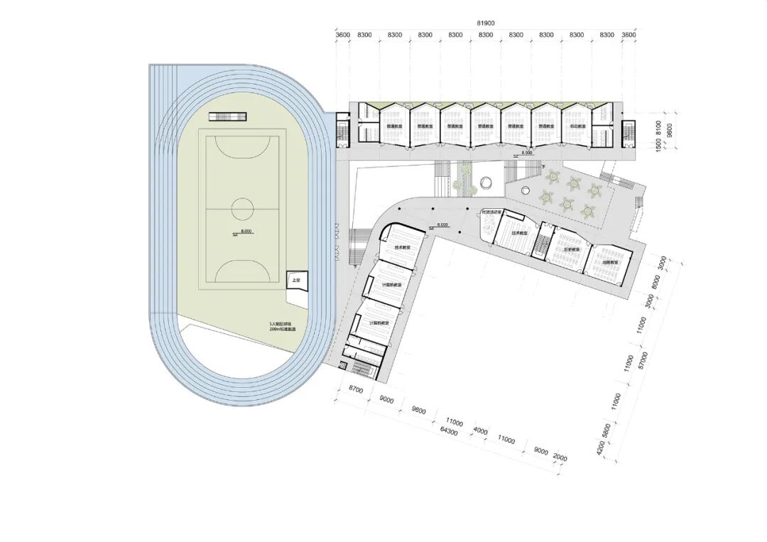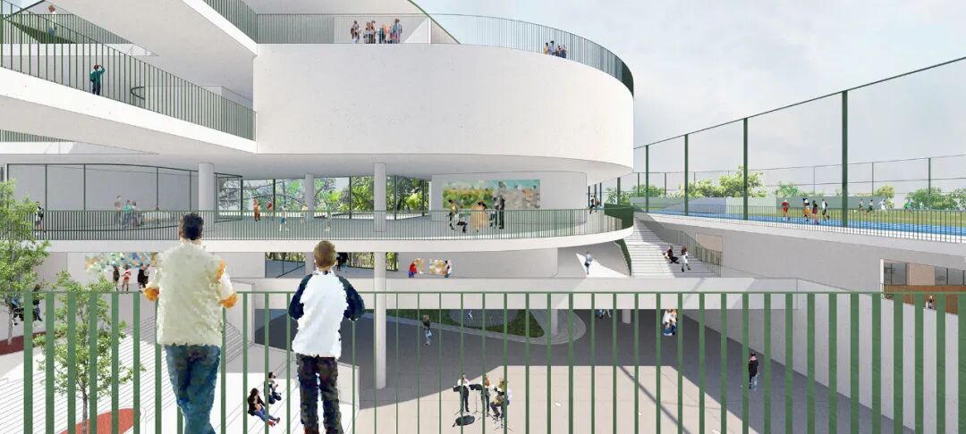 一条贯穿主体教学空间的”领结轴线”成为校园生活展开的“脊柱”。它将所有重要的教学与生活功能、以及运动场地联结一体,形成了具有“向心力”的核心校园场所。建筑楼层的错动为各层教室提供了可观的户外活动场地。它将“课间十分钟”从狭长的走廊里解放出来,并在高密度城市中恢复了传统校园内的空间尺度关系。