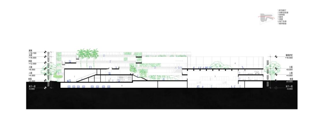 ▲ 剖面图(体育馆,操场,城市共享骑楼)