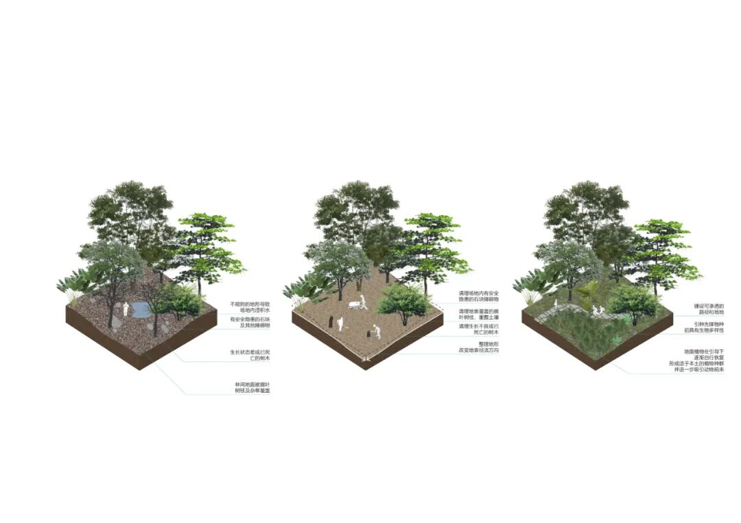 Z字形折线南侧的“软景”是一片绵延的、层次丰富的绿地。景观设计旨在校园内形成一片保留自然原本样貌的“都市野境”,而非修建过度的“人造景观”。通过严格限制地上与地下建筑物边界,方案尽最大可能地保障了土壤厚度,满足了包括大型乔木在内的各类植被生长需要。也为完整的保存现状“雨林”提供了条件。