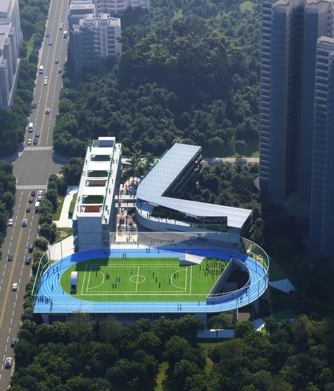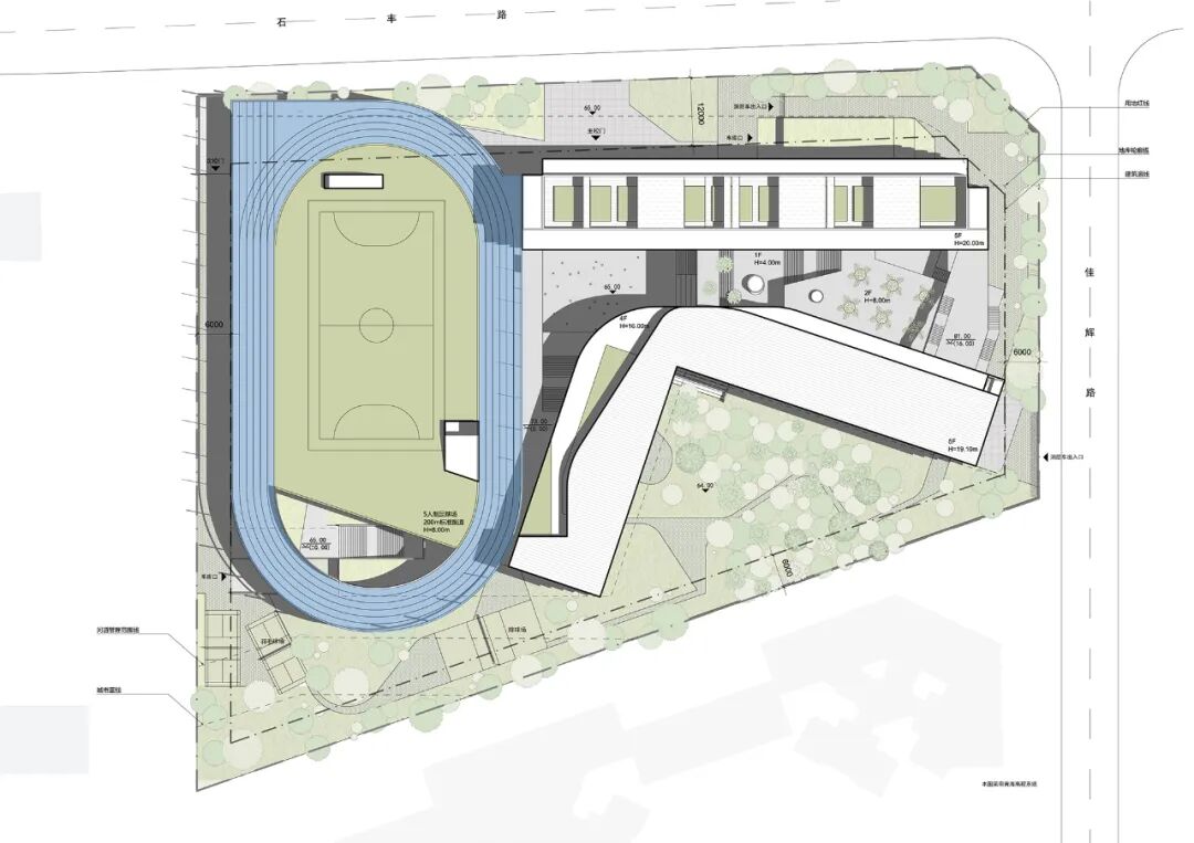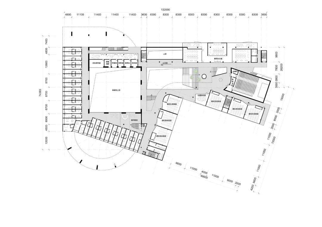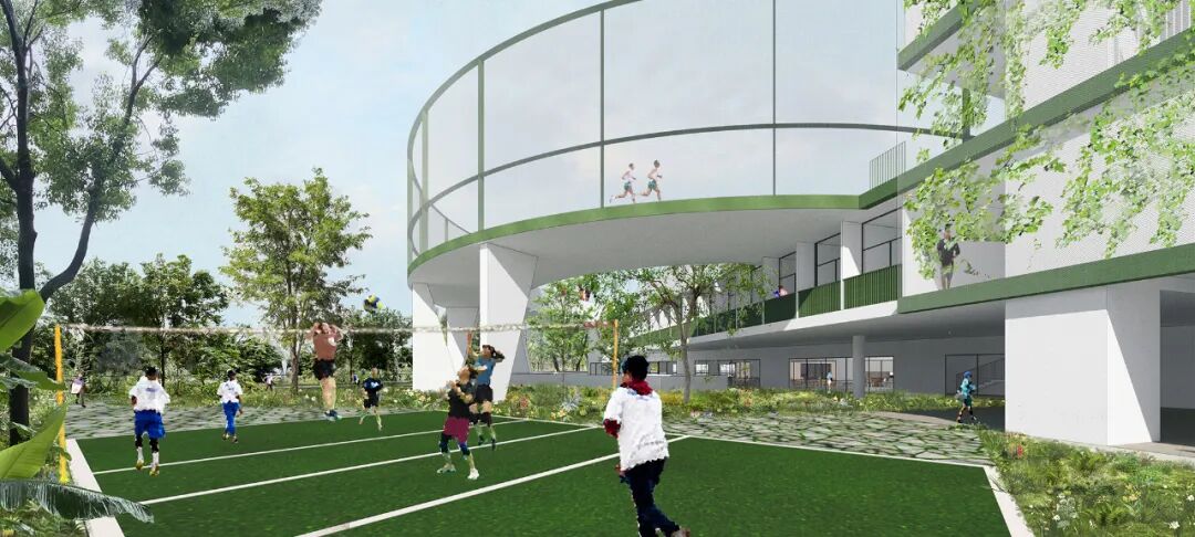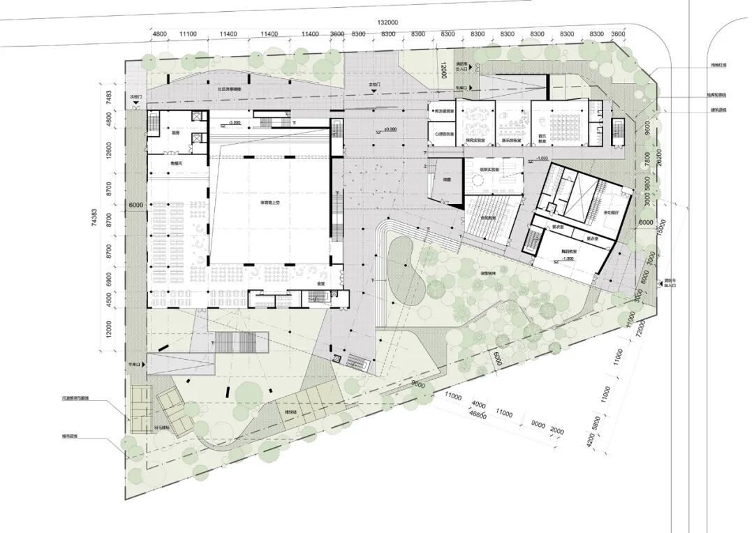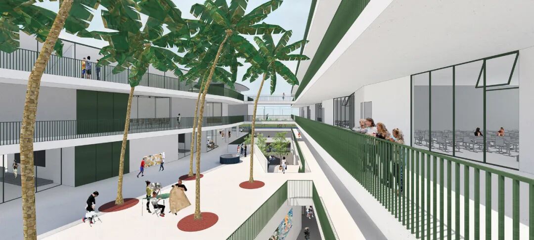 方案通过充分利用基地可建造范围,将建筑层数维持在5层及以下、同时将对采光与噪音要求最严苛的普通教室全部置于3层之上。大面积、对自然采光要求不高的公共功能(体育馆与、食堂、与多功能厅等)被妥善设置在低楼层,以此纾解高楼层的面积压力,让教室区域呈现轻松与疏朗的空间尺度,回归了传统校园的尺度感,避免高密度校园常见的拥挤和逼仄感。
