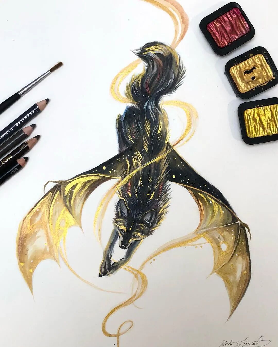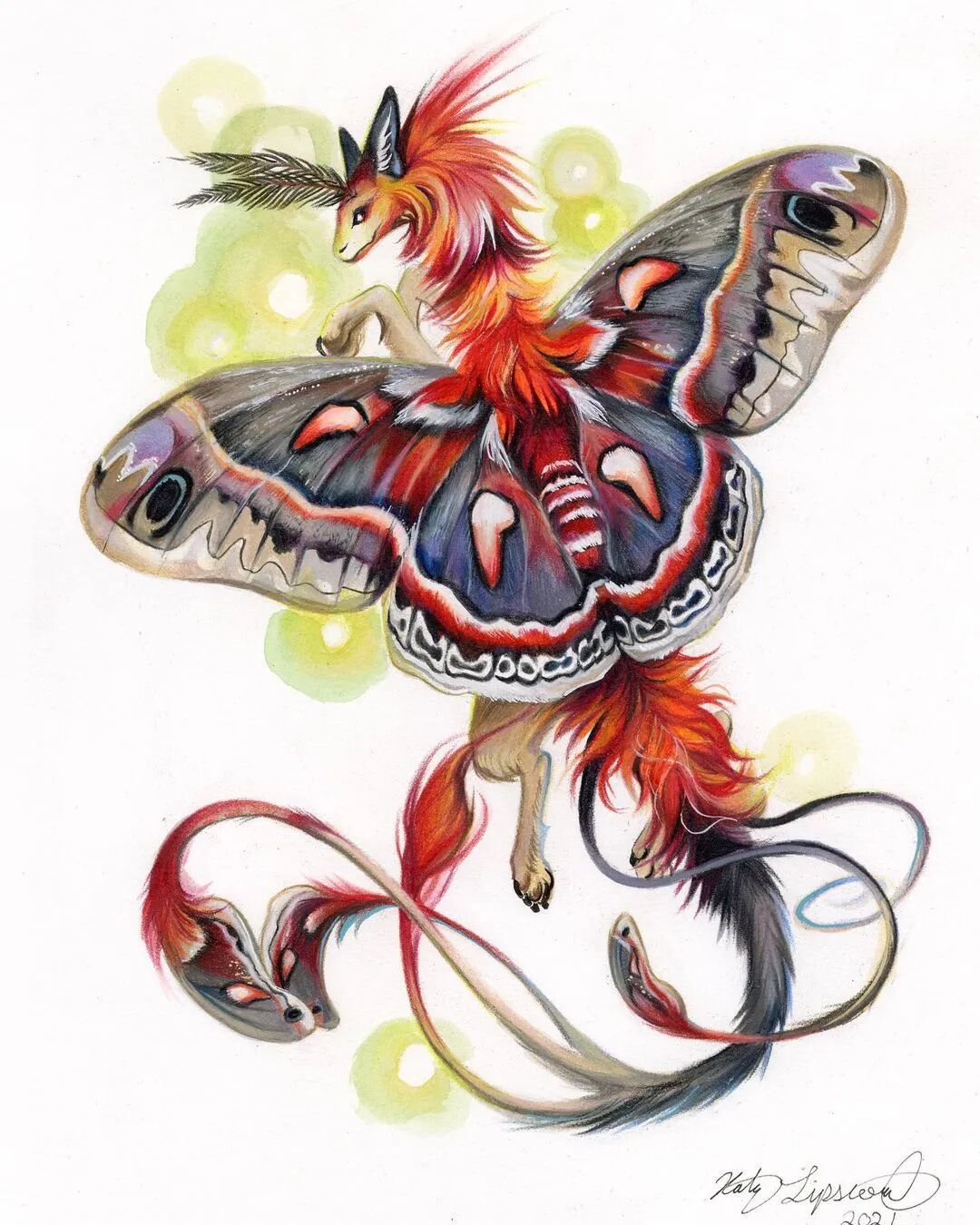 凯蒂·利普斯科姆创作的题材主要以动物为主,这些动物并不只是现实中存在的动物,而是他凭借想象力“嫁接”出来的奇异生物。我们可以从他的作品中看到许多传说中的生物,也可以看到鱼的身体、猫的脑袋,狼的身体却长出了一双翅膀。奇特的异形生物,就像是用魔法召唤出来的一样。