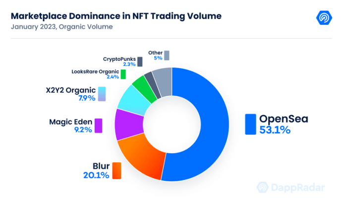 “1月份NFT市场飙升的一个原因是Yuga Labs的NFT交易量上升,它以3.248亿美元的交易量占NFT市场总交易量的34.3%。”