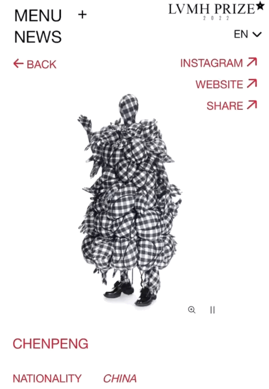 陈鹏,中国设计师,本科在苏州大学学习美术,研究生毕业于伦敦时装学院男装设计专业,并于2015年在伦敦创立同名品牌CHENPENG。2017年陈鹏登上福布斯亚洲排行榜<30 UNDER 30>, 2022年被张艺谋钦点为北京冬奥会开幕式首席服装设计师,同年入围LVMH PRIZE 2022半决赛。